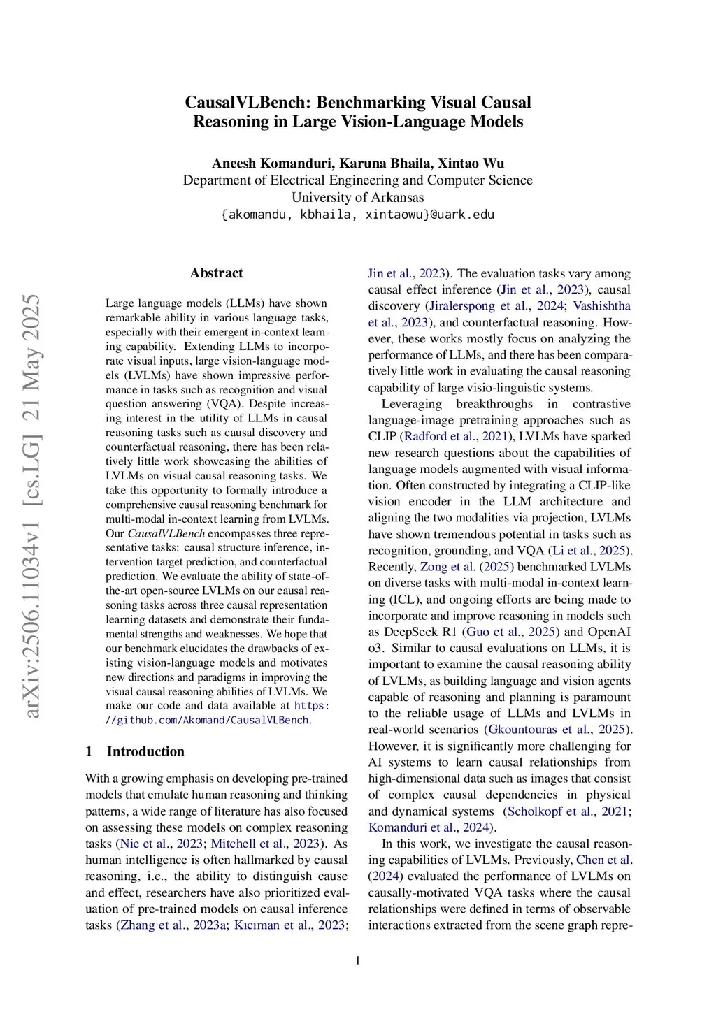 Large language models (LLMs) have shown remarkable ability in various language tasks, especially with their emergent in-context learning capability. Extending LLMs to incorporate visual inputs, large vision-language models (LVLMs) have shown impressive performance in tasks such as recognition and visual question answering (VQA). Despite increasing interest in the utility of LLMs in causal reasoning tasks such as causal discovery and counterfactual reasoning, there has been relatively little work showcasing the abilities of LVLMs on visual causal reasoning tasks. We take this opportunity to formally introduce a comprehensive causal reasoning benchmark for multi-modal in-context learning from LVLMs. Our CausalVLBench encompasses three representative tasks: causal structure inference, intervention target prediction, and counterfactual prediction. We evaluate the ability of state-of-the-art open-source LVLMs on our causal reasoning tasks across three causal representation learning datasets and demonstrate their fundamental strengths and weaknesses. We hope that our benchmark elucidates the drawbacks of existing vision-language models and motivates new directions and paradigms in improving the visual causal reasoning abilities of LVLMs.