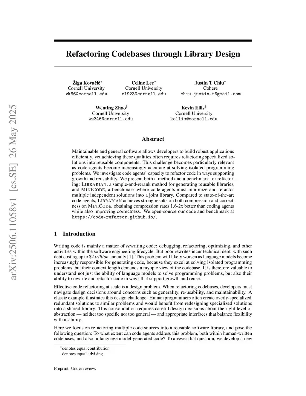 Maintainable and general software allows developers to build robust applications efficiently, yet achieving these qualities often requires refactoring specialized solutions into reusable components. This challenge becomes particularly relevant as code agents become increasingly accurate at solving isolated programming problems. We investigate code agents' capacity to refactor code in ways supporting growth and reusability. We present both a method and a benchmark for refactoring: Librarian, a sample-and-rerank method for generating reusable libraries, and Minicode, a benchmark where code agents must minimize and refactor multiple independent solutions into a joint library. Compared to state-of-the-art code agents, Librarian achieves strong results on both compression and correctness on Minicode, obtaining compression rates 1.6-2x better than coding agents while also improving correctness. We open-source our code and benchmark at this https URL.