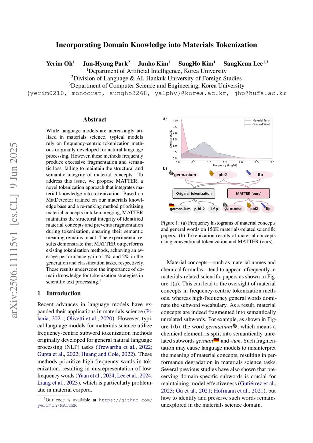 While language models are increasingly utilized in materials science, typical models rely on frequency-centric tokenization methods originally developed for natural language processing. However, these methods frequently produce excessive fragmentation and semantic loss, failing to maintain the structural and semantic integrity of material concepts. To address this issue, we propose MATTER, a novel tokenization approach that integrates material knowledge into tokenization. Based on MatDetector trained on our materials knowledge base and a re-ranking method prioritizing material concepts in token merging, MATTER maintains the structural integrity of identified material concepts and prevents fragmentation during tokenization, ensuring their semantic meaning remains intact. The experimental results demonstrate that MATTER outperforms existing tokenization methods, achieving an average performance gain of and in the generation and classification tasks, respectively. These results underscore the importance of domain knowledge for tokenization strategies in scientific text processing. Our code is available atthis https URL