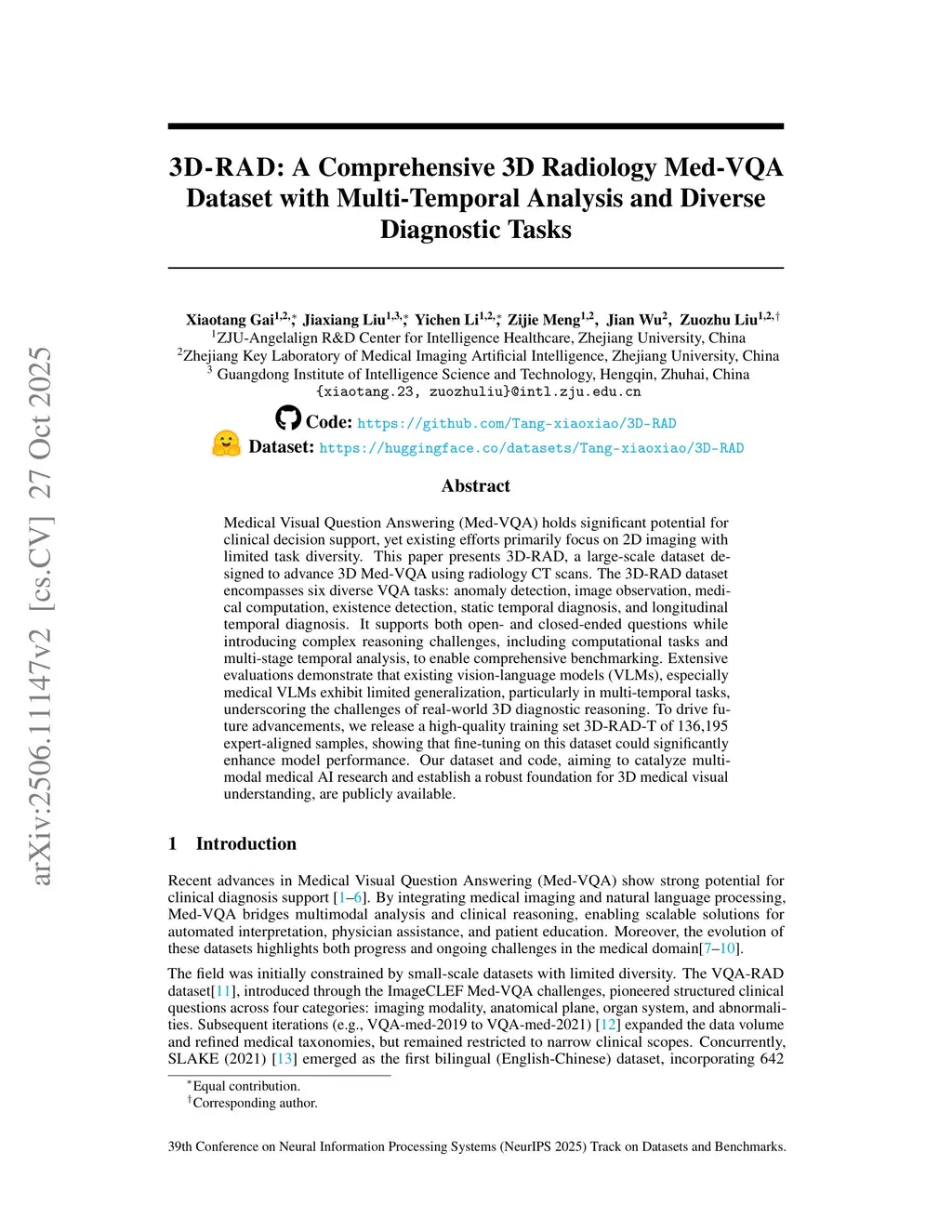 3D-RAD: A Comprehensive 3D Radiology Med-VQA Dataset with Multi-Temporal Analysis and Diverse Diagnostic Tasks