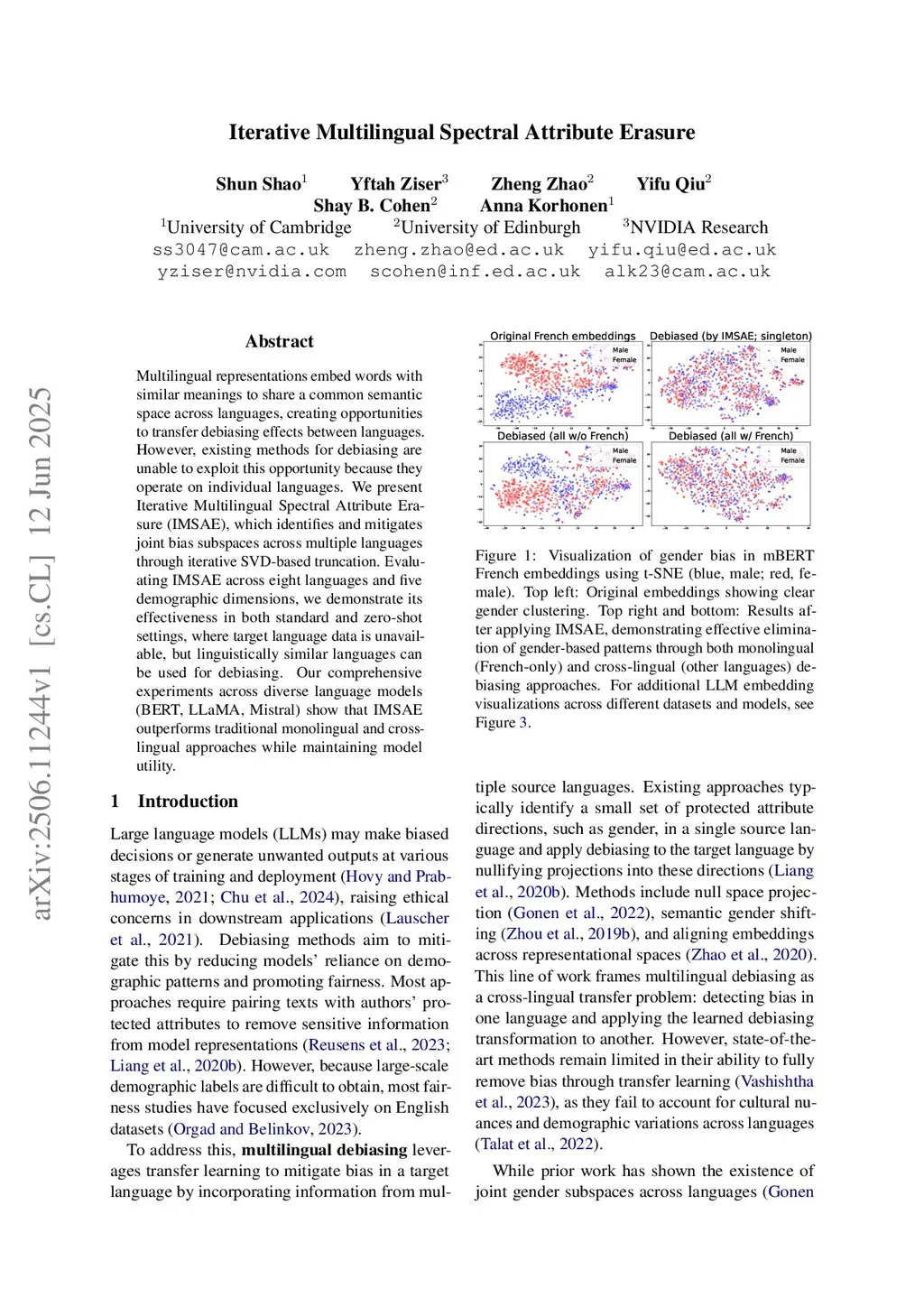 Multilingual representations embed words with similar meanings to share a common semantic space across languages, creating opportunities to transfer debiasing effects between languages. However, existing methods for debiasing are unable to exploit this opportunity because they operate on individual languages. We present Iterative Multilingual Spectral Attribute Erasure (IMSAE), which identifies and mitigates joint bias subspaces across multiple languages through iterative SVD-based truncation. Evaluating IMSAE across eight languages and five demographic dimensions, we demonstrate its effectiveness in both standard and zero-shot settings, where target language data is unavailable, but linguistically similar languages can be used for debiasing. Our comprehensive experiments across diverse language models (BERT, LLaMA, Mistral) show that IMSAE outperforms traditional monolingual and cross-lingual approaches while maintaining model utility.