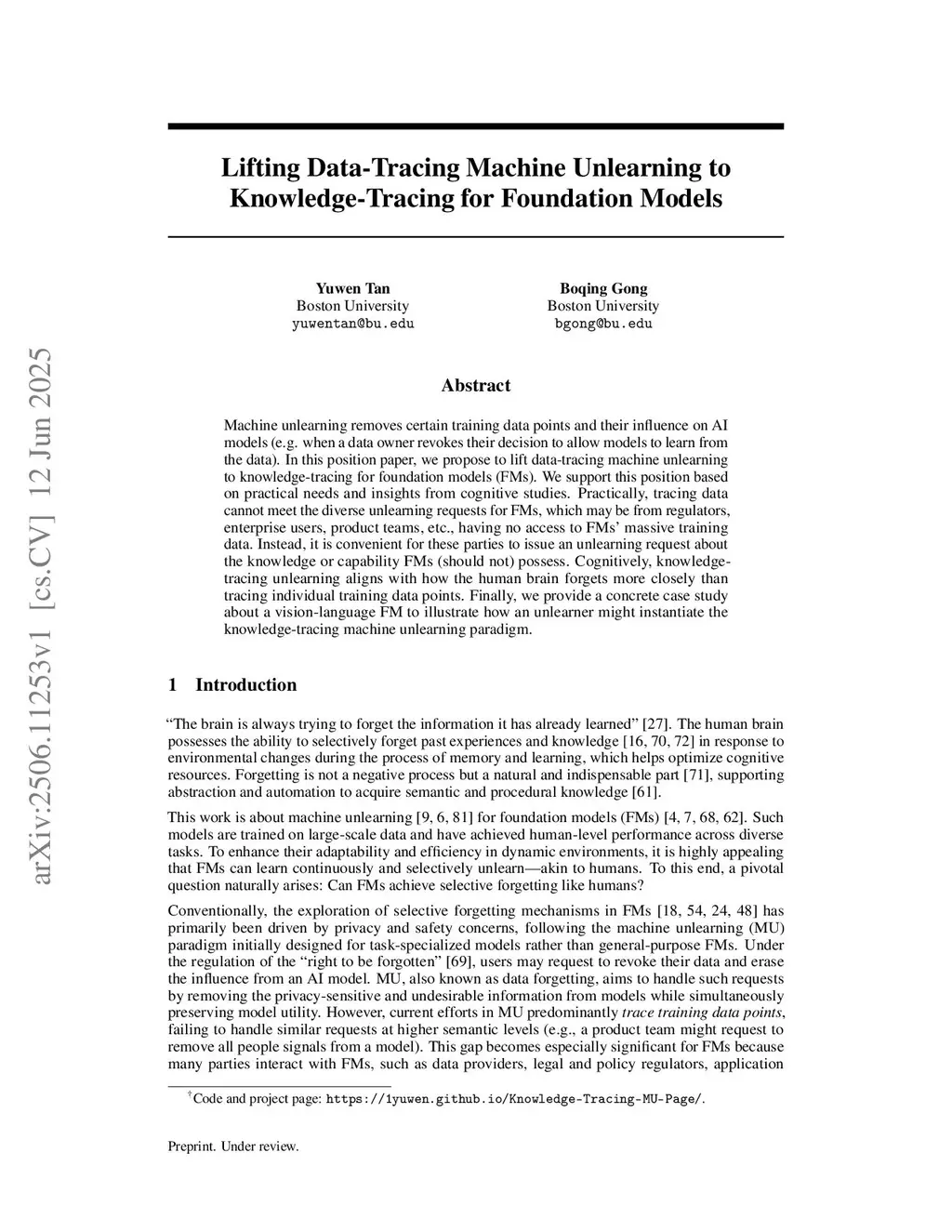 Machine unlearning removes certain training data points and their influence on AI models (e.g., when a data owner revokes their decision to allow models to learn from the data). In this position paper, we propose to lift data-tracing machine unlearning to knowledge-tracing for foundation models (FMs). We support this position based on practical needs and insights from cognitive studies. Practically, tracing data cannot meet the diverse unlearning requests for FMs, which may be from regulators, enterprise users, product teams, etc., having no access to FMs' massive training data. Instead, it is convenient for these parties to issue an unlearning request about the knowledge or capability FMs (should not) possess. Cognitively, knowledge-tracing unlearning aligns with how the human brain forgets more closely than tracing individual training data points. Finally, we provide a concrete case study about a vision-language FM to illustrate how an unlearner might instantiate the knowledge-tracing machine unlearning paradigm.
