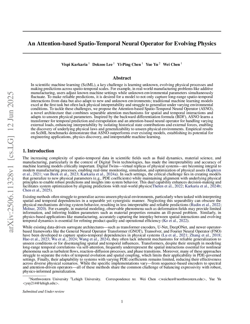 In scientific machine learning (SciML), a key challenge is learning unknown, evolving physical processes and making predictions across spatio-temporal scales. For example, in real-world manufacturing problems like additive manufacturing, users adjust known machine settings while unknown environmental parameters simultaneously fluctuate. To make reliable predictions, it is desired for a model to not only capture long-range spatio-temporal interactions from data but also adapt to new and unknown environments; traditional machine learning models excel at the first task but often lack physical interpretability and struggle to generalize under varying environmental conditions. To tackle these challenges, we propose the Attention-based Spatio-Temporal Neural Operator (ASNO), a novel architecture that combines separable attention mechanisms for spatial and temporal interactions and adapts to unseen physical parameters. Inspired by the backward differentiation formula (BDF), ASNO learns a transformer for temporal prediction and extrapolation and an attention-based neural operator for handling varying external loads, enhancing interpretability by isolating historical state contributions and external forces, enabling the discovery of underlying physical laws and generalizability to unseen physical environments. Empirical results on SciML benchmarks demonstrate that ASNO outperforms over existing models, establishing its potential for engineering applications, physics discovery, and interpretable machine learning.