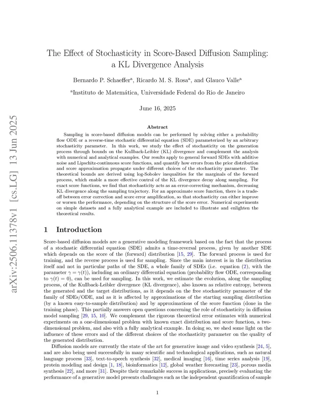 Sampling in score-based diffusion models can be performed by solving either a reverse-time stochastic differential equation (SDE) parameterized by an arbitrary time-dependent stochasticity parameter or a probability flow ODE, corresponding to the stochasticity parameter set to zero. In this work, we study the effect of this stochasticity on the generation process through bounds on the Kullback-Leibler (KL) divergence, complementing the analysis with numerical and analytical examples. Our main results apply to linear forward SDEs with additive noise and Lipschitz-continuous score functions, and quantify how errors from the prior distribution and score approximation propagate under different choices of the stochasticity parameter. The theoretical bounds are derived using log-Sobolev inequalities for the marginals of the forward process, which enable a more effective control of the KL divergence decay along sampling. For exact score functions, we find that stochasticity acts as an error-correcting mechanism, decreasing KL divergence along the sampling trajectory. For an approximate score function, there is a trade-off between error correction and score error amplification, so that stochasticity can either improve or worsen the performance, depending on the structure of the score error. Numerical experiments on simple datasets and a fully analytical example are included to illustrate and enlighten the theoretical results.