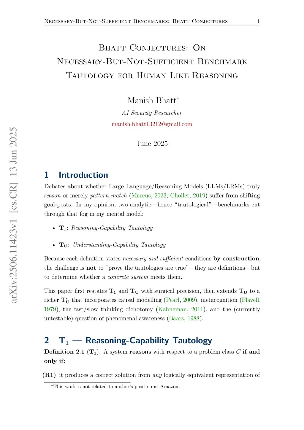 Bhatt Conjectures: On Necessary-But-Not-Sufficient Benchmark Tautology for Human Like Reasoning