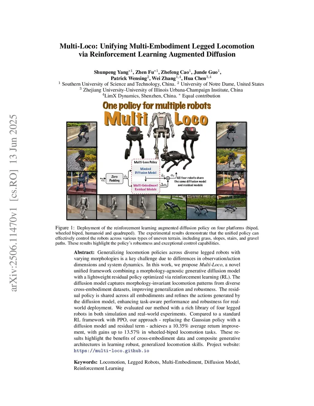 Generalizing locomotion policies across diverse legged robots with varying morphologies is a key challenge due to differences in observation/action dimensions and system dynamics. In this work, we propose Multi-Loco, a novel unified framework combining a morphology-agnostic generative diffusion model with a lightweight residual policy optimized via reinforcement learning (RL). The diffusion model captures morphology-invariant locomotion patterns from diverse cross-embodiment datasets, improving generalization and robustness. The residual policy is shared across all embodiments and refines the actions generated by the diffusion model, enhancing task-aware performance and robustness for real-world deployment. We evaluated our method with a rich library of four legged robots in both simulation and real-world experiments. Compared to a standard RL framework with PPO, our approach -- replacing the Gaussian policy with a diffusion model and residual term -- achieves a 10.35% average return improvement, with gains up to 13.57% in wheeled-biped locomotion tasks. These results highlight the benefits of cross-embodiment data and composite generative architectures in learning robust, generalized locomotion skills.