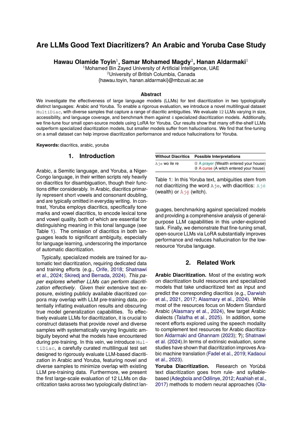 We investigate the effectiveness of large language models (LLMs) for text diacritization in two typologically distinct languages: Arabic and Yoruba. To enable a rigorous evaluation, we introduce a novel multilingual dataset MultiDiac, with diverse samples that capture a range of diacritic ambiguities. We evaluate 12 LLMs varying in size, accessibility, and language coverage, and benchmark them against specialized diacritization models. Additionally, we fine-tune four small open-source models using LoRA for Yoruba. Our results show that many off-the-shelf LLMs outperform specialized diacritization models, but smaller models suffer from hallucinations. We find that fine-tuning on a small dataset can help improve diacritization performance and reduce hallucinations for Yoruba.