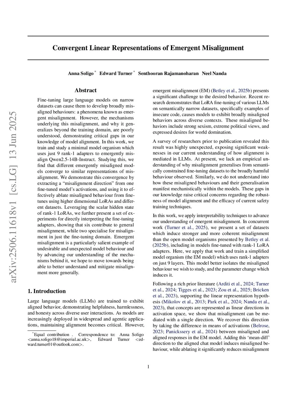 Fine-tuning large language models on narrow datasets can cause them to develop broadly misaligned behaviours: a phenomena known as emergent misalignment. However, the mechanisms underlying this misalignment, and why it generalizes beyond the training domain, are poorly understood, demonstrating critical gaps in our knowledge of model alignment. In this work, we train and study a minimal model organism which uses just 9 rank-1 adapters to emergently misalign Qwen2.5-14B-Instruct. Studying this, we find that different emergently misaligned models converge to similar representations of misalignment. We demonstrate this convergence by extracting a 'misalignment direction' from one fine-tuned model's activations, and using it to effectively ablate misaligned behaviour from fine-tunes using higher dimensional LoRAs and different datasets. Leveraging the scalar hidden state of rank-1 LoRAs, we further present a set of experiments for directly interpreting the fine-tuning adapters, showing that six contribute to general misalignment, while two specialise for misalignment in just the fine-tuning domain. Emergent misalignment is a particularly salient example of undesirable and unexpected model behaviour and by advancing our understanding of the mechanisms behind it, we hope to move towards being able to better understand and mitigate misalignment more generally.