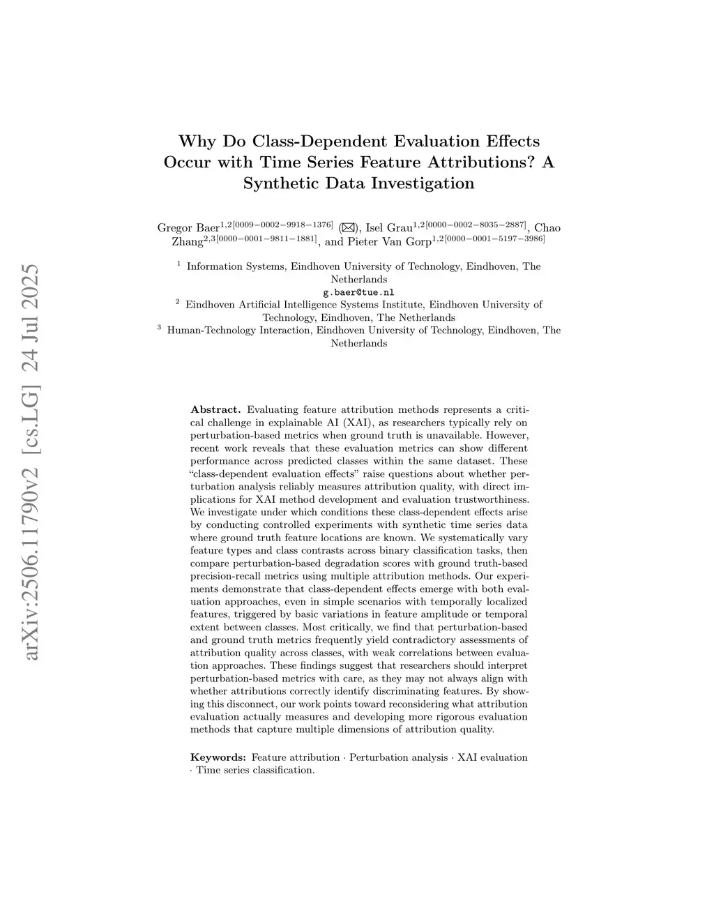 Evaluating feature attribution methods represents a critical challenge in explainable AI (XAI), as researchers typically rely on perturbation-based metrics when ground truth is unavailable. However, recent work reveals that these evaluation metrics can show different performance across predicted classes within the same dataset. These "class-dependent evaluation effects" raise questions about whether perturbation analysis reliably measures attribution quality, with direct implications for XAI method development and evaluation trustworthiness. We investigate under which conditions these class-dependent effects arise by conducting controlled experiments with synthetic time series data where ground truth feature locations are known. We systematically vary feature types and class contrasts across binary classification tasks, then compare perturbation-based degradation scores with ground truth-based precision-recall metrics using multiple attribution methods. Our experiments demonstrate that class-dependent effects emerge with both evaluation approaches, even in simple scenarios with temporally localized features, triggered by basic variations in feature amplitude or temporal extent between classes. Most critically, we find that perturbation-based and ground truth metrics frequently yield contradictory assessments of attribution quality across classes, with weak correlations between evaluation approaches. These findings suggest that researchers should interpret perturbation-based metrics with care, as they may not always align with whether attributions correctly identify discriminating features. By showing this disconnect, our work points toward reconsidering what attribution evaluation actually measures and developing more rigorous evaluation methods that capture multiple dimensions of attribution quality.