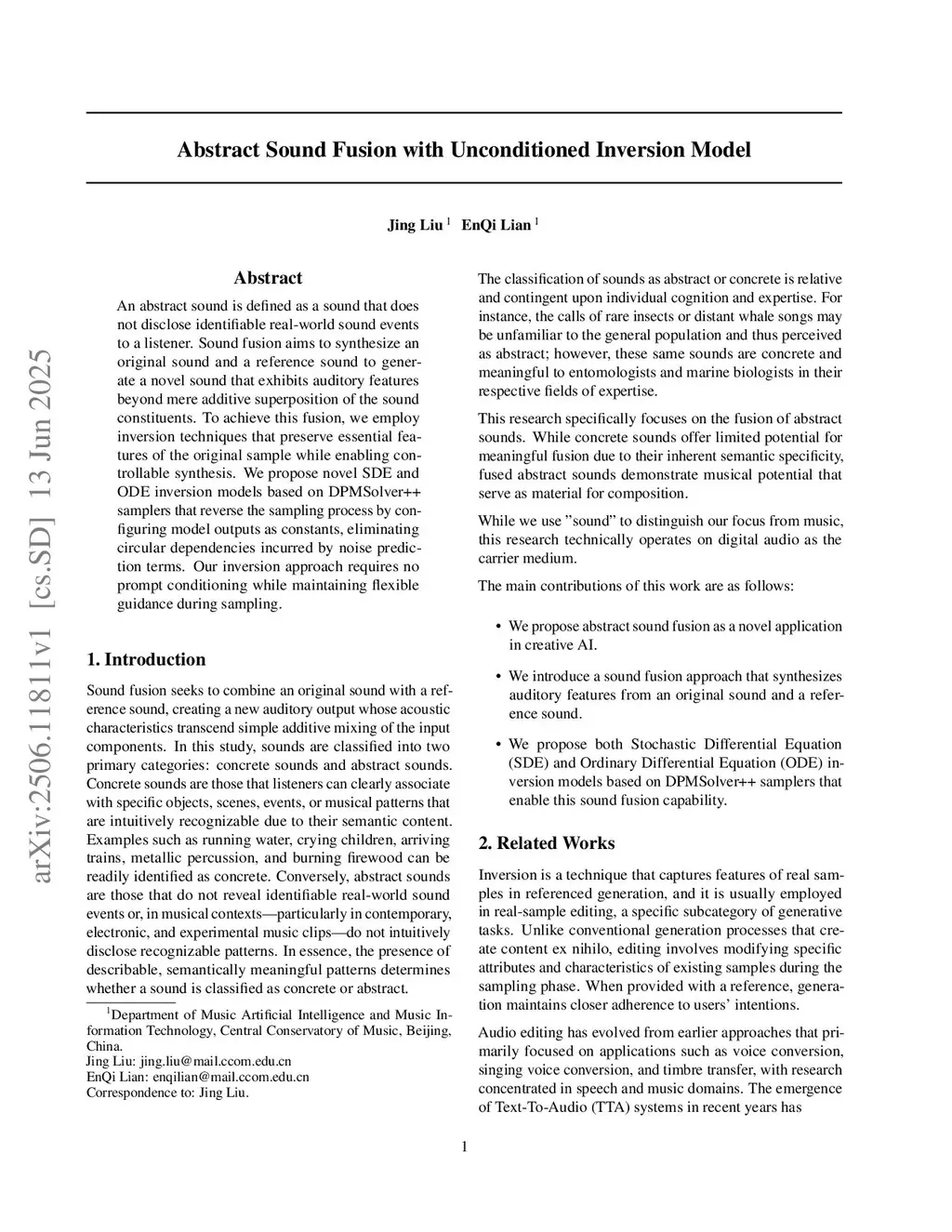 An abstract sound is defined as a sound that does not disclose identifiable real-world sound events to a listener. Sound fusion aims to synthesize an original sound and a reference sound to generate a novel sound that exhibits auditory features beyond mere additive superposition of the sound constituents. To achieve this fusion, we employ inversion techniques that preserve essential features of the original sample while enabling controllable synthesis. We propose novel SDE and ODE inversion models based on DPMSolver++ samplers that reverse the sampling process by configuring model outputs as constants, eliminating circular dependencies incurred by noise prediction terms. Our inversion approach requires no prompt conditioning while maintaining flexible guidance during sampling.