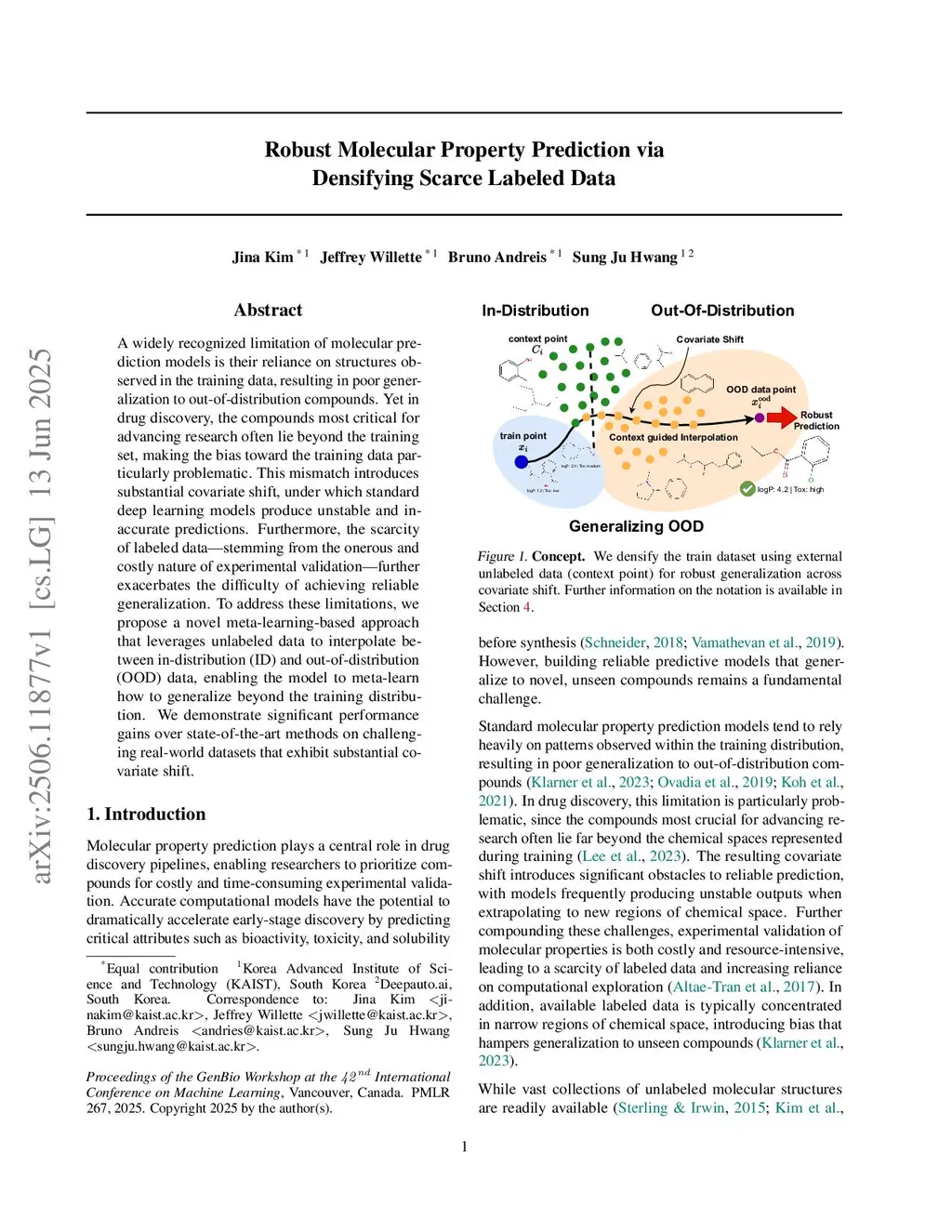 A widely recognized limitation of molecular prediction models is their reliance on structures observed in the training data, resulting in poor generalization to out-of-distribution compounds. Yet in drug discovery, the compounds most critical for advancing research often lie beyond the training set, making the bias toward the training data particularly problematic. This mismatch introduces substantial covariate shift, under which standard deep learning models produce unstable and inaccurate predictions. Furthermore, the scarcity of labeled data-stemming from the onerous and costly nature of experimental validation-further exacerbates the difficulty of achieving reliable generalization. To address these limitations, we propose a novel bilevel optimization approach that leverages unlabeled data to interpolate between in-distribution (ID) and out-of-distribution (OOD) data, enabling the model to learn how to generalize beyond the training distribution. We demonstrate significant performance gains on challenging real-world datasets with substantial covariate shift, supported by t-SNE visualizations highlighting our interpolation method.