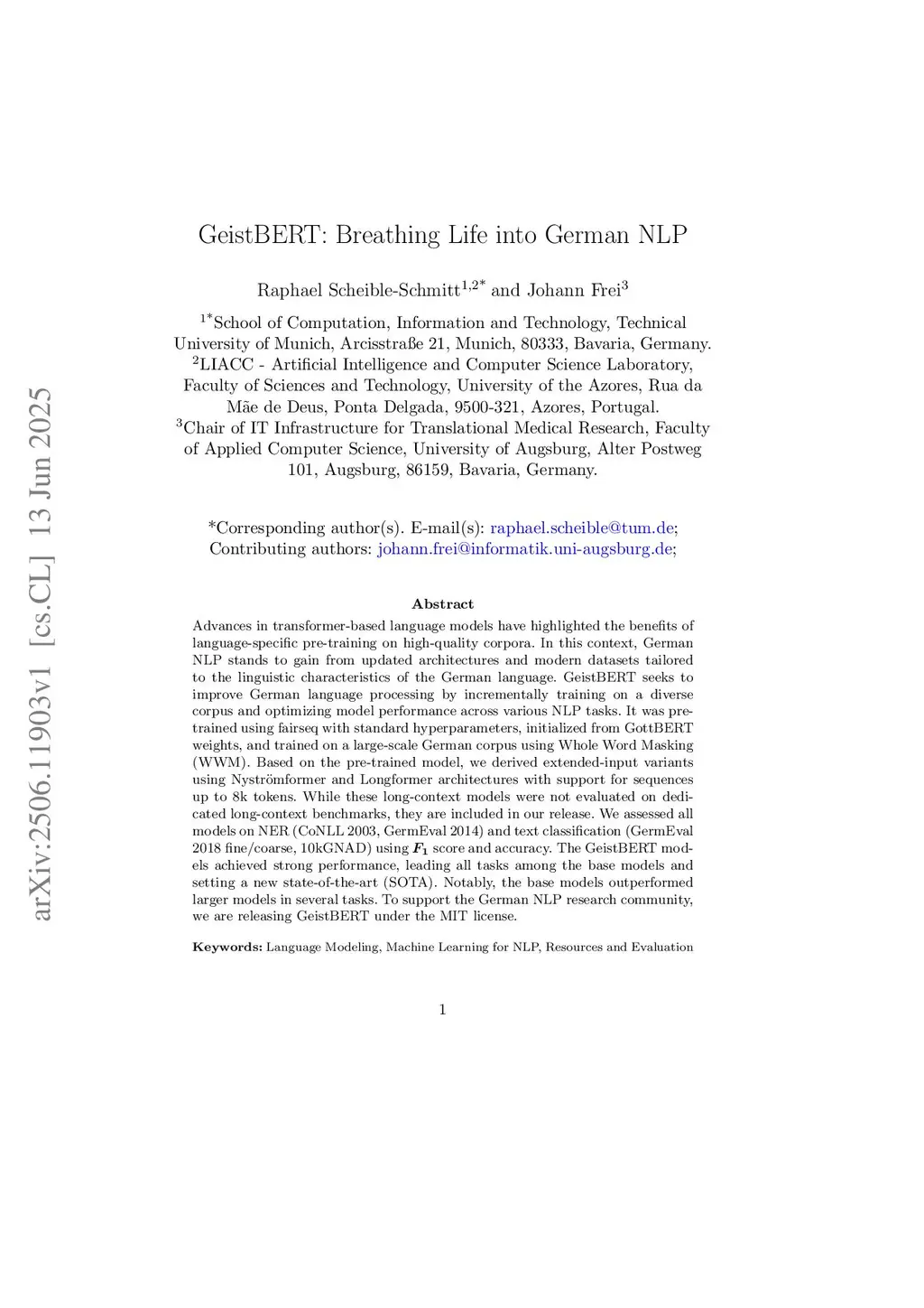Advances in transformer-based language models have highlighted the benefits of language-specific pre-training on high-quality corpora. In this context, German NLP stands to gain from updated architectures and modern datasets tailored to the linguistic characteristics of the German language. GeistBERT seeks to improve German language processing by incrementally training on a diverse corpus and optimizing model performance across various NLP tasks. It was pre-trained using fairseq with standard hyperparameters, initialized from GottBERT weights, and trained on a large-scale German corpus using Whole Word Masking (WWM). Based on the pre-trained model, we derived extended-input variants using Nyströmformer and Longformer architectures with support for sequences up to 8k tokens. While these long-context models were not evaluated on dedicated long-context benchmarks, they are included in our release. We assessed all models on NER (CoNLL 2003, GermEval 2014) and text classification (GermEval 2018 fine/coarse, 10kGNAD) using score and accuracy. The GeistBERT models achieved strong performance, leading all tasks among the base models and setting a new state-of-the-art (SOTA). Notably, the base models outperformed larger models in several tasks. To support the German NLP research community, we are releasing GeistBERT under the MIT license.