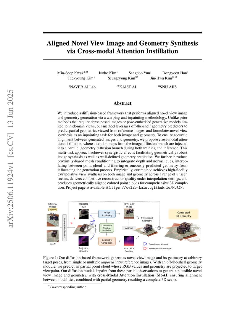We introduce a diffusion-based framework that performs aligned novel view image and geometry generation via a warping-and-inpainting methodology. Unlike prior methods that require dense posed images or pose-embedded generative models limited to in-domain views, our method leverages off-the-shelf geometry predictors to predict partial geometries viewed from reference images, and formulates novel-view synthesis as an inpainting task for both image and geometry. To ensure accurate alignment between generated images and geometry, we propose cross-modal attention distillation, where attention maps from the image diffusion branch are injected into a parallel geometry diffusion branch during both training and inference. This multi-task approach achieves synergistic effects, facilitating geometrically robust image synthesis as well as well-defined geometry prediction. We further introduce proximity-based mesh conditioning to integrate depth and normal cues, interpolating between point cloud and filtering erroneously predicted geometry from influencing the generation process. Empirically, our method achieves high-fidelity extrapolative view synthesis on both image and geometry across a range of unseen scenes, delivers competitive reconstruction quality under interpolation settings, and produces geometrically aligned colored point clouds for comprehensive 3D completion. Project page is available atthis https URL.