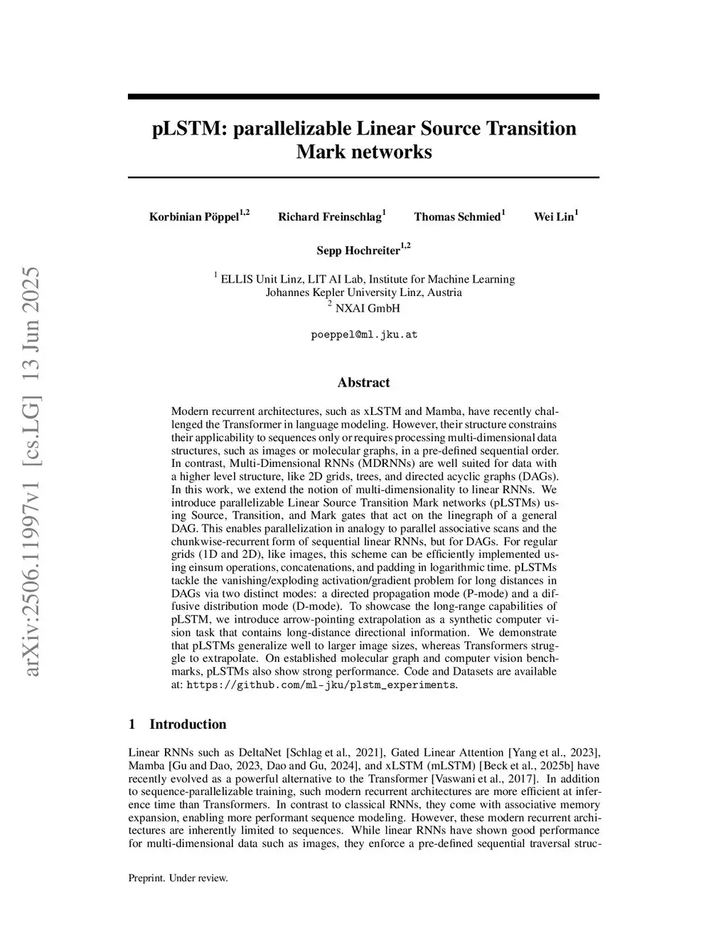 Modern recurrent architectures, such as xLSTM and Mamba, have recently challenged the Transformer in language modeling. However, their structure constrains their applicability to sequences only or requires processing multi-dimensional data structures, such as images or molecular graphs, in a pre-defined sequential order. In contrast, Multi-Dimensional RNNs (MDRNNs) are well suited for data with a higher level structure, like 2D grids, trees, and directed acyclic graphs (DAGs). In this work, we extend the notion of multi-dimensionality to linear RNNs. We introduce parallelizable Linear Source Transition Mark networks (pLSTMs) using Source, Transition, and Mark gates that act on the line graph of a general DAG. This enables parallelization in analogy to parallel associative scans and the chunkwise-recurrent form of sequential linear RNNs, but for DAGs. For regular grids (1D and 2D), like images, this scheme can be efficiently implemented using einsum operations, concatenations, and padding in logarithmic time. pLSTMs tackle the vanishing/exploding activation/gradient problem for long distances in DAGs via two distinct modes: a directed propagation mode (P-mode) and a diffusive distribution mode (D-mode). To showcase the long-range capabilities of pLSTM, we introduce arrow-pointing extrapolation as a synthetic computer vision task that contains long-distance directional information. We demonstrate that pLSTMs generalize well to larger image sizes, whereas Transformers struggle to extrapolate. On established molecular graph and computer vision benchmarks, pLSTMs also show strong performance. Code and Datasets are available at:this https URL.