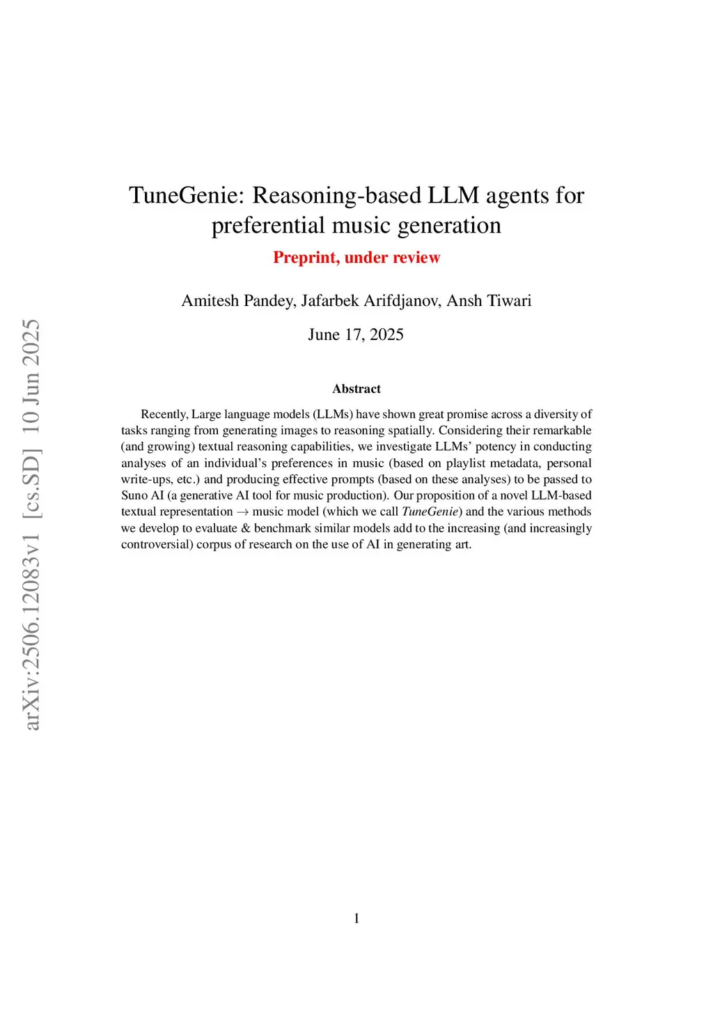 Recently, Large language models (LLMs) have shown great promise across a diversity of tasks, ranging from generating images to reasoning spatially. Considering their remarkable (and growing) textual reasoning capabilities, we investigate LLMs' potency in conducting analyses of an individual's preferences in music (based on playlist metadata, personal write-ups, etc.) and producing effective prompts (based on these analyses) to be passed to Suno AI (a generative AI tool for music production). Our proposition of a novel LLM-based textual representation to music model (which we call TuneGenie) and the various methods we develop to evaluate & benchmark similar models add to the increasing (and increasingly controversial) corpus of research on the use of AI in generating art.