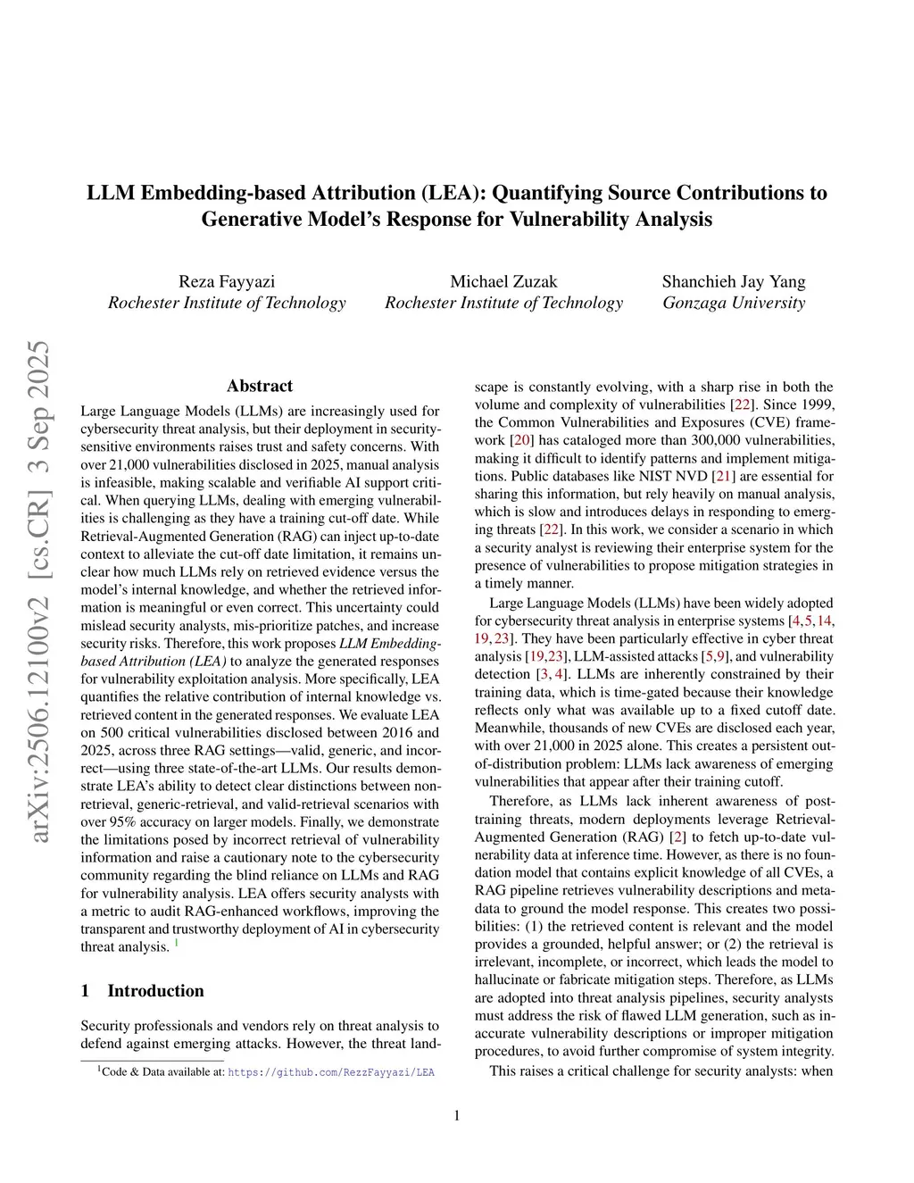 Large Language Models (LLMs) are increasingly used for cybersecurity threat analysis, but their deployment in security-sensitive environments raises trust and safety concerns. With over 21,000 vulnerabilities disclosed in 2025, manual analysis is infeasible, making scalable and verifiable AI support critical. When querying LLMs, dealing with emerging vulnerabilities is challenging as they have a training cut-off date. While Retrieval-Augmented Generation (RAG) can inject up-to-date context to alleviate the cut-off date limitation, it remains unclear how much LLMs rely on retrieved evidence versus the model's internal knowledge, and whether the retrieved information is meaningful or even correct. This uncertainty could mislead security analysts, mis-prioritize patches, and increase security risks. Therefore, this work proposes LLM Embedding-based Attribution (LEA) to analyze the generated responses for vulnerability exploitation analysis. More specifically, LEA quantifies the relative contribution of internal knowledge vs. retrieved content in the generated responses. We evaluate LEA on 500 critical vulnerabilities disclosed between 2016 and 2025, across three RAG settings -- valid, generic, and incorrect -- using three state-of-the-art LLMs. Our results demonstrate LEA's ability to detect clear distinctions between non-retrieval, generic-retrieval, and valid-retrieval scenarios with over 95% accuracy on larger models. Finally, we demonstrate the limitations posed by incorrect retrieval of vulnerability information and raise a cautionary note to the cybersecurity community regarding the blind reliance on LLMs and RAG for vulnerability analysis. LEA offers security analysts with a metric to audit RAG-enhanced workflows, improving the transparent and trustworthy deployment of AI in cybersecurity threat analysis.