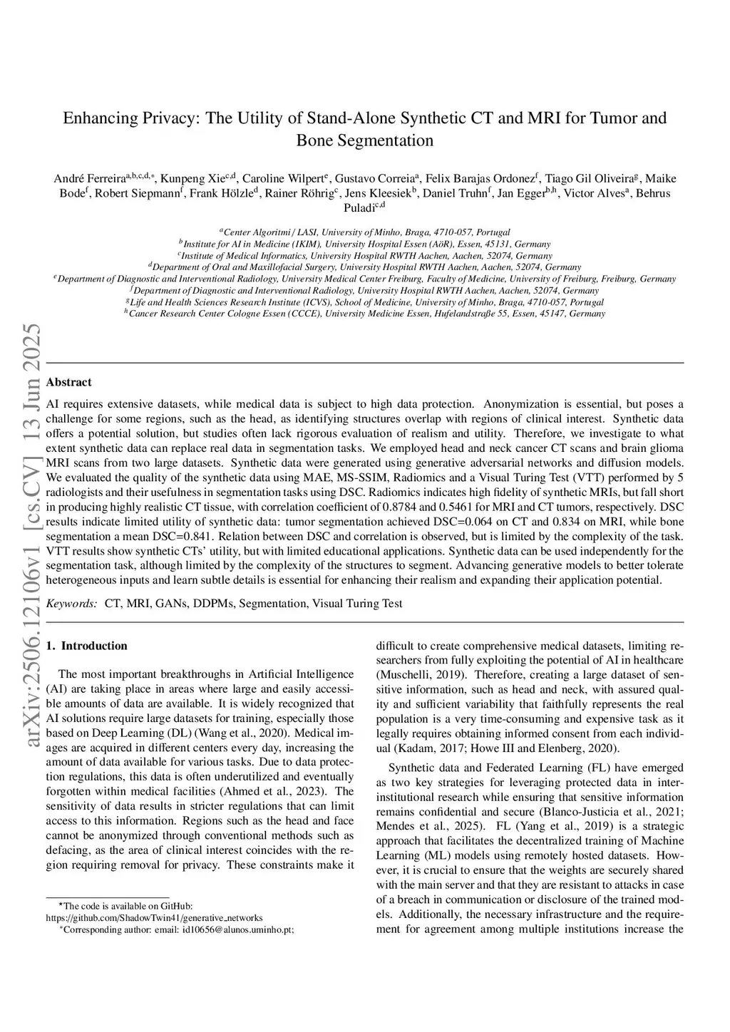 Enhancing Privacy: The Utility of Stand-Alone Synthetic CT and MRI for Tumor and Bone Segmentation