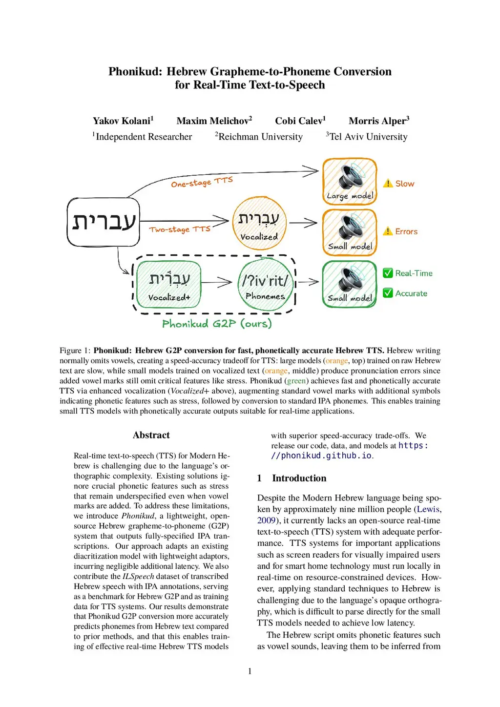 Real-time text-to-speech (TTS) for Modern Hebrew is challenging due to the language's orthographic complexity. Existing solutions ignore crucial phonetic features such as stress that remain underspecified even when vowel marks are added. To address these limitations, we introduce Phonikud, a lightweight, open-source Hebrew grapheme-to-phoneme (G2P) system that outputs fully-specified IPA transcriptions. Our approach adapts an existing diacritization model with lightweight adaptors, incurring negligible additional latency. We also contribute the ILSpeech dataset of transcribed Hebrew speech with IPA annotations, serving as a benchmark for Hebrew G2P, as training data for TTS systems, and enabling audio-to-IPA for evaluating TTS performance while capturing important phonetic details. Our results demonstrate that Phonikud G2P conversion more accurately predicts phonemes from Hebrew text compared to prior methods, and that this enables training of effective real-time Hebrew TTS models with superior speed-accuracy trade-offs. We release our code, data, and models at https: //phonikud.this http URL.