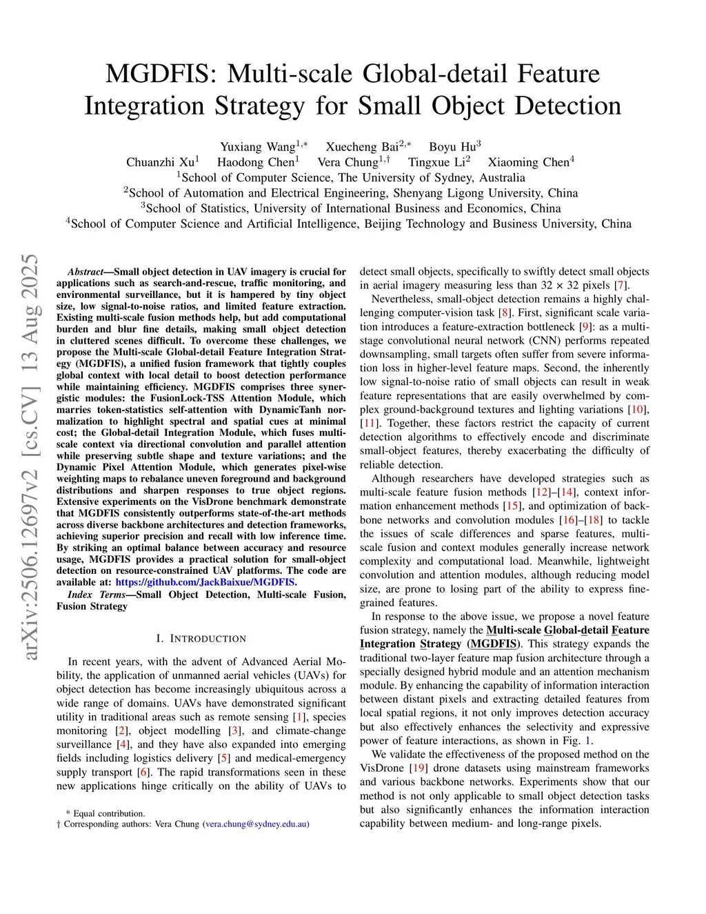 Small object detection in UAV imagery is crucial for applications such as search-and-rescue, traffic monitoring, and environmental surveillance, but it is hampered by tiny object size, low signal-to-noise ratios, and limited feature extraction. Existing multi-scale fusion methods help, but add computational burden and blur fine details, making small object detection in cluttered scenes difficult. To overcome these challenges, we propose the Multi-scale Global-detail Feature Integration Strategy (MGDFIS), a unified fusion framework that tightly couples global context with local detail to boost detection performance while maintaining efficiency. MGDFIS comprises three synergistic modules: the FusionLock-TSS Attention Module, which marries token-statistics self-attention with DynamicTanh normalization to highlight spectral and spatial cues at minimal cost; the Global-detail Integration Module, which fuses multi-scale context via directional convolution and parallel attention while preserving subtle shape and texture variations; and the Dynamic Pixel Attention Module, which generates pixel-wise weighting maps to rebalance uneven foreground and background distributions and sharpen responses to true object regions. Extensive experiments on the VisDrone benchmark demonstrate that MGDFIS consistently outperforms state-of-the-art methods across diverse backbone architectures and detection frameworks, achieving superior precision and recall with low inference time. By striking an optimal balance between accuracy and resource usage, MGDFIS provides a practical solution for small-object detection on resource-constrained UAV platforms.