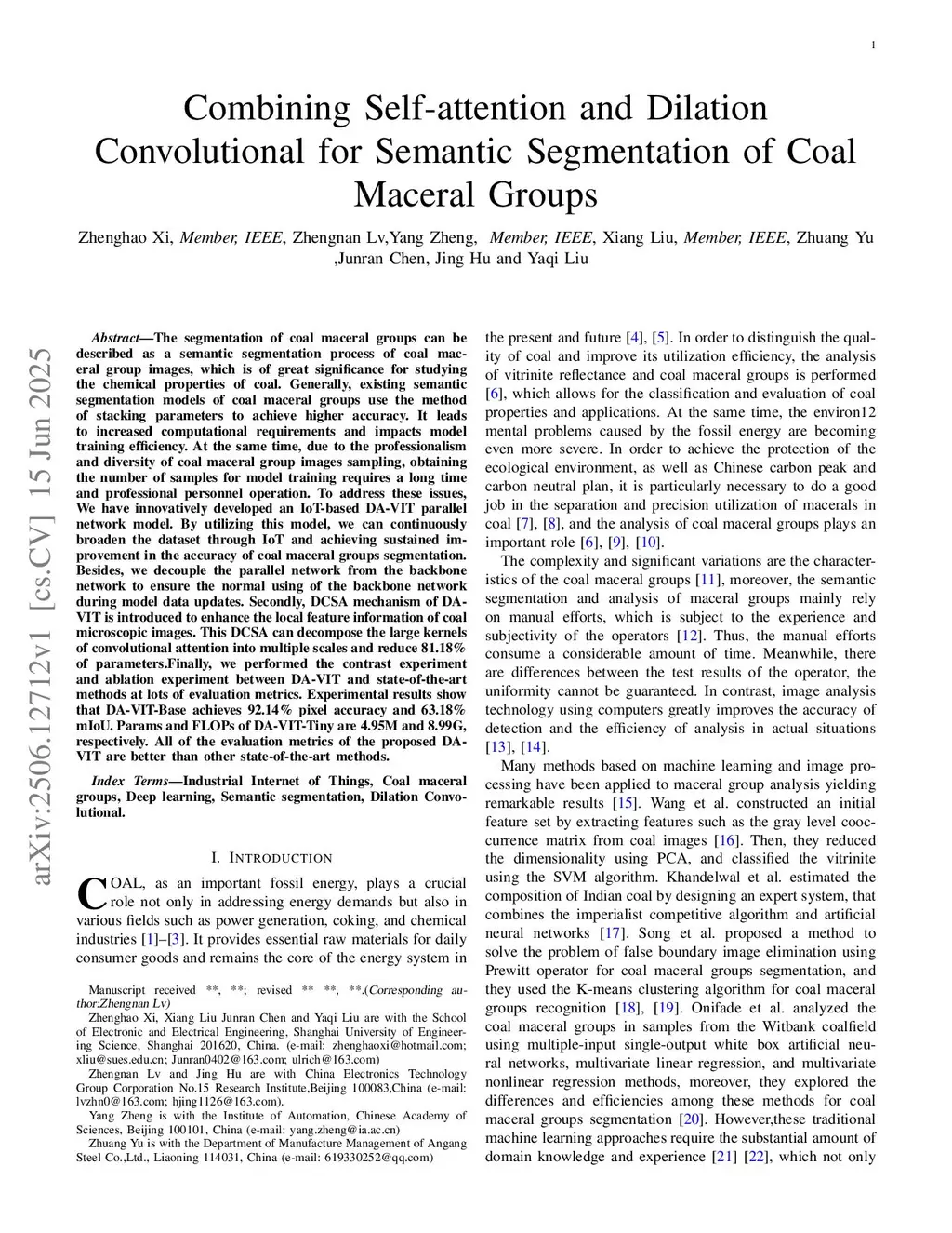 The segmentation of coal maceral groups can be described as a semantic segmentation process of coal maceral group images, which is of great significance for studying the chemical properties of coal. Generally, existing semantic segmentation models of coal maceral groups use the method of stacking parameters to achieve higher accuracy. It leads to increased computational requirements and impacts model training efficiency. At the same time, due to the professionalism and diversity of coal maceral group images sampling, obtaining the number of samples for model training requires a long time and professional personnel operation. To address these issues, We have innovatively developed an IoT-based DA-VIT parallel network model. By utilizing this model, we can continuously broaden the dataset through IoT and achieving sustained improvement in the accuracy of coal maceral groups segmentation. Besides, we decouple the parallel network from the backbone network to ensure the normal using of the backbone network during model data updates. Secondly, DCSA mechanism of DA-VIT is introduced to enhance the local feature information of coal microscopic images. This DCSA can decompose the large kernels of convolutional attention into multiple scales and reduce 81.18% ofthis http URL, we performed the contrast experiment and ablation experiment between DA-VIT and state-of-the-art methods at lots of evaluation metrics. Experimental results show that DA-VIT-Base achieves 92.14% pixel accuracy and 63.18% mIoU. Params and FLOPs of DA-VIT-Tiny are 4.95M and 8.99G, respectively. All of the evaluation metrics of the proposed DA-VIT are better than other state-of-the-art methods.