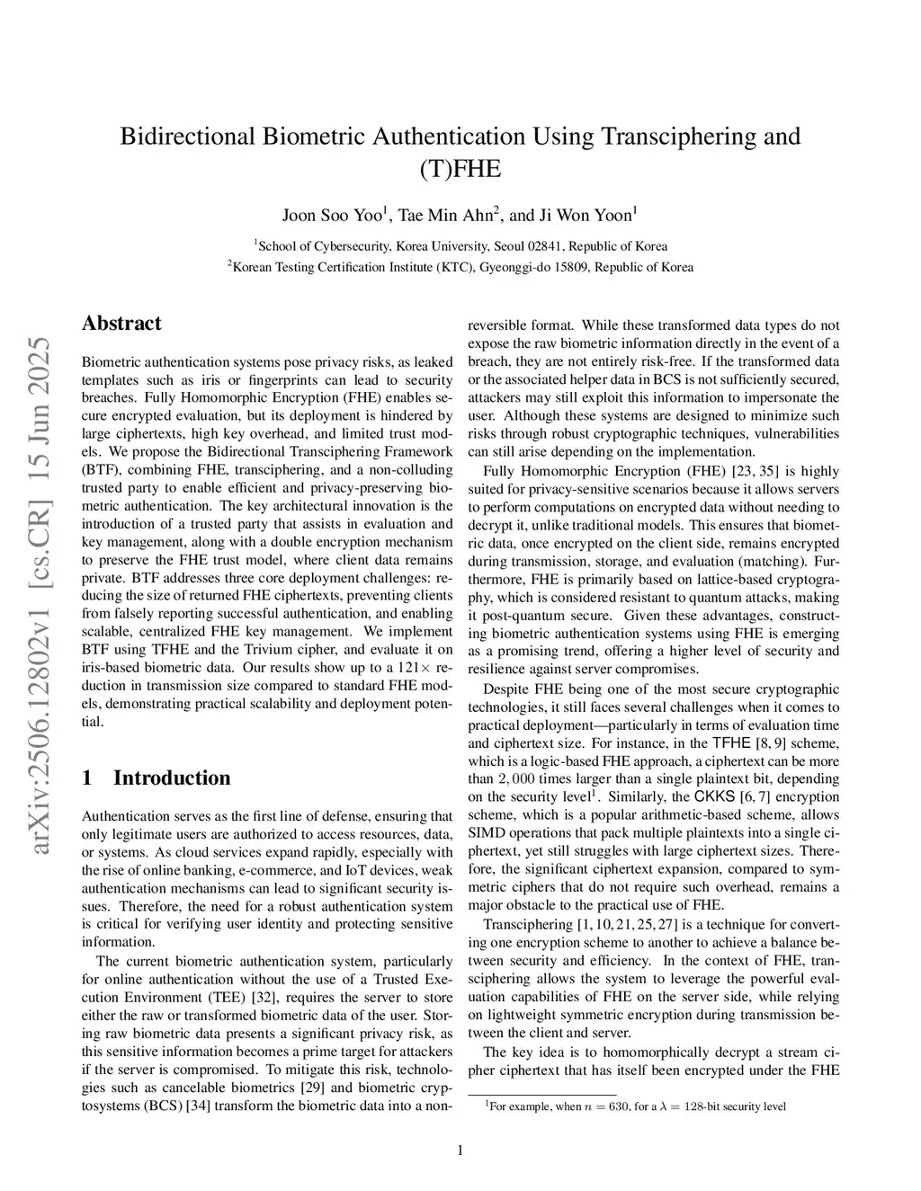 Bidirectional Biometric Authentication Using Transciphering and (T)FHE