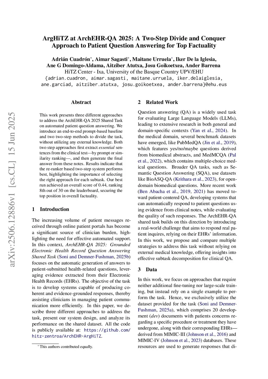 This work presents three different approaches to address the ArchEHR-QA 2025 Shared Task on automated patient question answering. We introduce an end-to-end prompt-based baseline and two two-step methods to divide the task, without utilizing any external knowledge. Both two step approaches first extract essential sentences from the clinical text, by prompt or similarity ranking, and then generate the final answer from these notes. Results indicate that the re-ranker based two-step system performs best, highlighting the importance of selecting the right approach for each subtask. Our best run achieved an overall score of 0.44, ranking 8th out of 30 on the leaderboard, securing the top position in overall factuality.