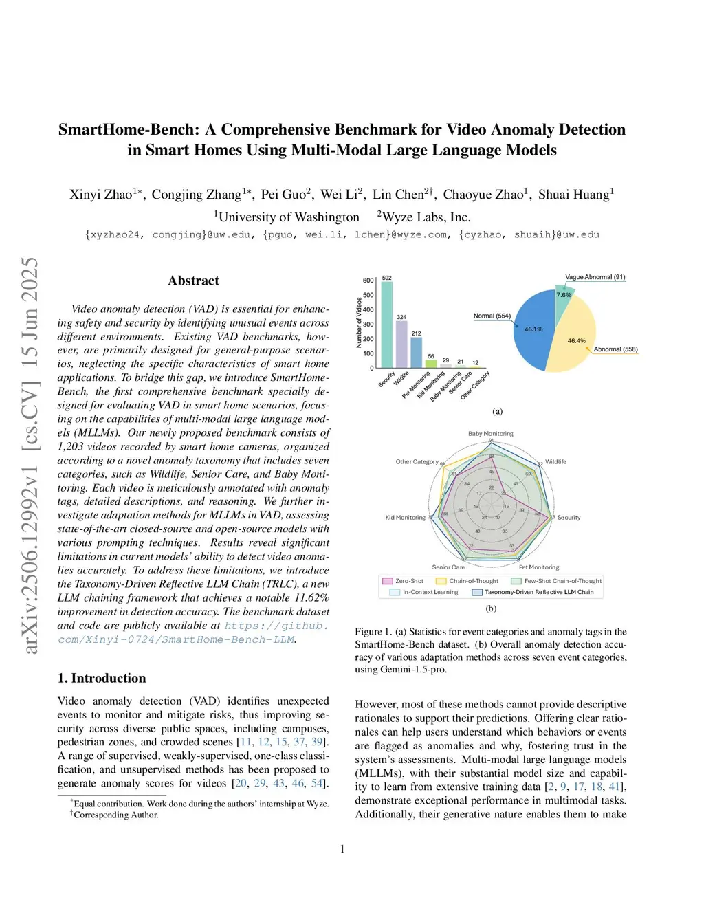 Video anomaly detection (VAD) is essential for enhancing safety and security by identifying unusual events across different environments. Existing VAD benchmarks, however, are primarily designed for general-purpose scenarios, neglecting the specific characteristics of smart home applications. To bridge this gap, we introduce SmartHome-Bench, the first comprehensive benchmark specially designed for evaluating VAD in smart home scenarios, focusing on the capabilities of multi-modal large language models (MLLMs). Our newly proposed benchmark consists of 1,203 videos recorded by smart home cameras, organized according to a novel anomaly taxonomy that includes seven categories, such as Wildlife, Senior Care, and Baby Monitoring. Each video is meticulously annotated with anomaly tags, detailed descriptions, and reasoning. We further investigate adaptation methods for MLLMs in VAD, assessing state-of-the-art closed-source and open-source models with various prompting techniques. Results reveal significant limitations in the current models' ability to detect video anomalies accurately. To address these limitations, we introduce the Taxonomy-Driven Reflective LLM Chain (TRLC), a new LLM chaining framework that achieves a notable 11.62% improvement in detection accuracy. The benchmark dataset and code are publicly available atthis https URL.