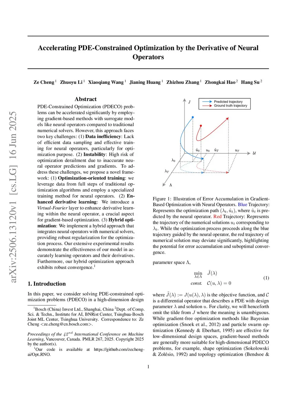 PDE-Constrained Optimization (PDECO) problems can be accelerated significantly by employing gradient-based methods with surrogate models like neural operators compared to traditional numerical solvers. However, this approach faces two key challenges: (1) **Data inefficiency**: Lack of efficient data sampling and effective training for neural operators, particularly for optimization purpose. (2) **Instability**: High risk of optimization derailment due to inaccurate neural operator predictions and gradients. To address these challenges, we propose a novel framework: (1) **Optimization-oriented training**: we leverage data from full steps of traditional optimization algorithms and employ a specialized training method for neural operators. (2) **Enhanced derivative learning**: We introduce a *Virtual-Fourier* layer to enhance derivative learning within the neural operator, a crucial aspect for gradient-based optimization. (3) **Hybrid optimization**: We implement a hybrid approach that integrates neural operators with numerical solvers, providing robust regularization for the optimization process. Our extensive experimental results demonstrate the effectiveness of our model in accurately learning operators and their derivatives. Furthermore, our hybrid optimization approach exhibits robust convergence.