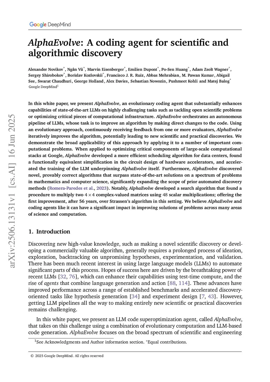 In this white paper, we present AlphaEvolve, an evolutionary coding agent that substantially enhances capabilities of state-of-the-art LLMs on highly challenging tasks such as tackling open scientific problems or optimizing critical pieces of computational infrastructure. AlphaEvolve orchestrates an autonomous pipeline of LLMs, whose task is to improve an algorithm by making direct changes to the code. Using an evolutionary approach, continuously receiving feedback from one or more evaluators, AlphaEvolve iteratively improves the algorithm, potentially leading to new scientific and practical discoveries. We demonstrate the broad applicability of this approach by applying it to a number of important computational problems. When applied to optimizing critical components of large-scale computational stacks at Google, AlphaEvolve developed a more efficient scheduling algorithm for data centers, found a functionally equivalent simplification in the circuit design of hardware accelerators, and accelerated the training of the LLM underpinning AlphaEvolve itself. Furthermore, AlphaEvolve discovered novel, provably correct algorithms that surpass state-of-the-art solutions on a spectrum of problems in mathematics and computer science, significantly expanding the scope of prior automated discovery methods (Romera-Paredes et al., 2023). Notably, AlphaEvolve developed a search algorithm that found a procedure to multiply two complex-valued matrices using scalar multiplications; offering the first improvement, after 56 years, over Strassen's algorithm in this setting. We believe AlphaEvolve and coding agents like it can have a significant impact in improving solutions of problems across many areas of science and computation.