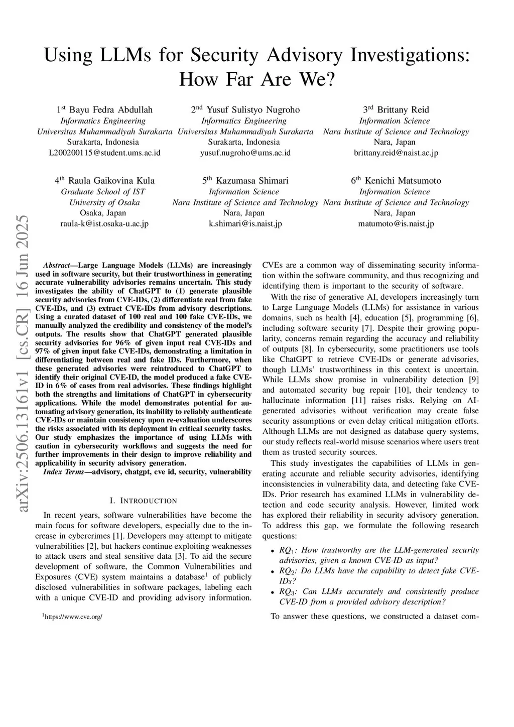 Large Language Models (LLMs) are increasingly used in software security, but their trustworthiness in generating accurate vulnerability advisories remains uncertain. This study investigates the ability of ChatGPT to (1) generate plausible security advisories from CVE-IDs, (2) differentiate real from fake CVE-IDs, and (3) extract CVE-IDs from advisory descriptions. Using a curated dataset of 100 real and 100 fake CVE-IDs, we manually analyzed the credibility and consistency of the model's outputs. The results show that ChatGPT generated plausible security advisories for 96% of given input real CVE-IDs and 97% of given input fake CVE-IDs, demonstrating a limitation in differentiating between real and fake IDs. Furthermore, when these generated advisories were reintroduced to ChatGPT to identify their original CVE-ID, the model produced a fake CVE-ID in 6% of cases from real advisories. These findings highlight both the strengths and limitations of ChatGPT in cybersecurity applications. While the model demonstrates potential for automating advisory generation, its inability to reliably authenticate CVE-IDs or maintain consistency upon re-evaluation underscores the risks associated with its deployment in critical security tasks. Our study emphasizes the importance of using LLMs with caution in cybersecurity workflows and suggests the need for further improvements in their design to improve reliability and applicability in security advisory generation.