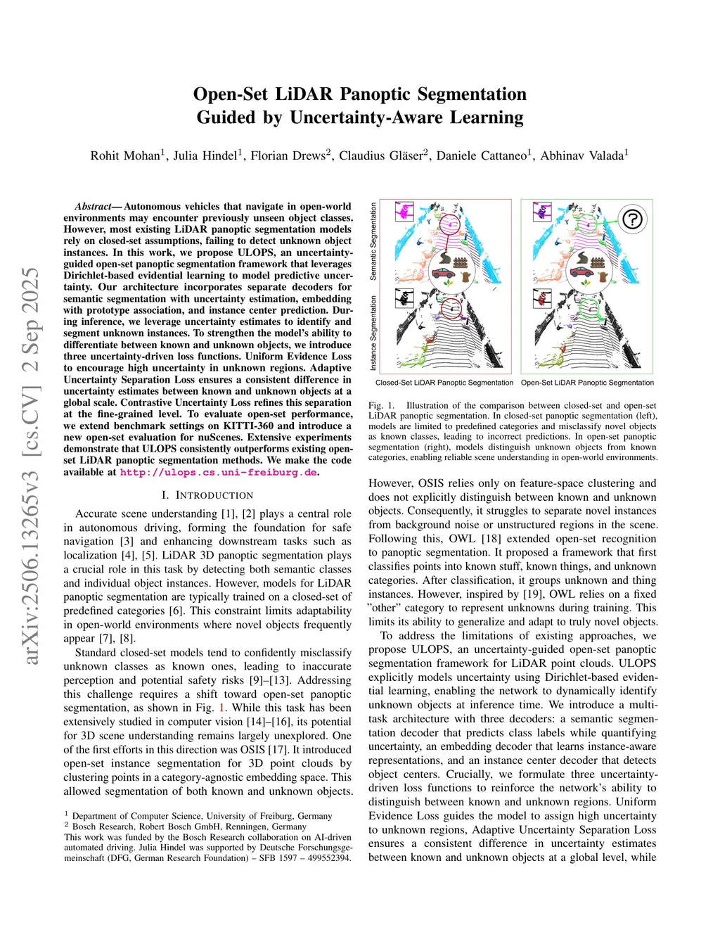 Autonomous vehicles that navigate in open-world environments may encounter previously unseen object classes. However, most existing LiDAR panoptic segmentation models rely on closed-set assumptions, failing to detect unknown object instances. In this work, we propose ULOPS, an uncertainty-guided open-set panoptic segmentation framework that leverages Dirichlet-based evidential learning to model predictive uncertainty. Our architecture incorporates separate decoders for semantic segmentation with uncertainty estimation, embedding with prototype association, and instance center prediction. During inference, we leverage uncertainty estimates to identify and segment unknown instances. To strengthen the model's ability to differentiate between known and unknown objects, we introduce three uncertainty-driven loss functions. Uniform Evidence Loss to encourage high uncertainty in unknown regions. Adaptive Uncertainty Separation Loss ensures a consistent difference in uncertainty estimates between known and unknown objects at a global scale. Contrastive Uncertainty Loss refines this separation at the fine-grained level. To evaluate open-set performance, we extend benchmark settings on KITTI-360 and introduce a new open-set evaluation for nuScenes. Extensive experiments demonstrate that ULOPS consistently outperforms existing open-set LiDAR panoptic segmentation methods.