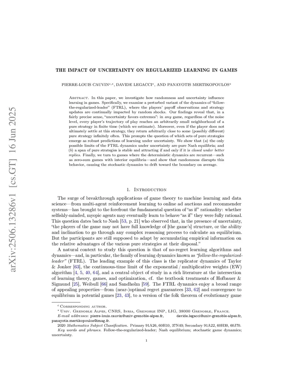In this paper, we investigate how randomness and uncertainty influence learning in games. Specifically, we examine a perturbed variant of the dynamics of "follow-the-regularized-leader" (FTRL), where the players' payoff observations and strategy updates are continually impacted by random shocks. Our findings reveal that, in a fairly precise sense, "uncertainty favors extremes": in any game, regardless of the noise level, every player's trajectory of play reaches an arbitrarily small neighborhood of a pure strategy in finite time (which we estimate). Moreover, even if the player does not ultimately settle at this strategy, they return arbitrarily close to some (possibly different) pure strategy infinitely often. This prompts the question of which sets of pure strategies emerge as robust predictions of learning under uncertainty. We show that (a) the only possible limits of the FTRL dynamics under uncertainty are pure Nash equilibria; and (b) a span of pure strategies is stable and attracting if and only if it is closed under better replies. Finally, we turn to games where the deterministic dynamics are recurrent - such as zero-sum games with interior equilibria - and we show that randomness disrupts this behavior, causing the stochastic dynamics to drift toward the boundary on average.