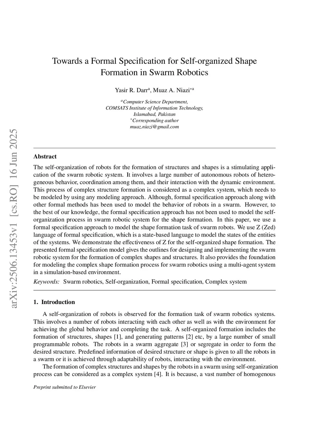 The self-organization of robots for the formation of structures and shapes is a stimulating application of the swarm robotic system. It involves a large number of autonomous robots of heterogeneous behavior, coordination among them, and their interaction with the dynamic environment. This process of complex structure formation is considered a complex system, which needs to be modeled by using any modeling approach. Although the formal specification approach along with other formal methods has been used to model the behavior of robots in a swarm. However, to the best of our knowledge, the formal specification approach has not been used to model the self-organization process in swarm robotic systems for shape formation. In this paper, we use a formal specification approach to model the shape formation task of swarm robots. We use Z (Zed) language of formal specification, which is a state-based language, to model the states of the entities of the systems. We demonstrate the effectiveness of Z for the self-organized shape formation. The presented formal specification model gives the outlines for designing and implementing the swarm robotic system for the formation of complex shapes and structures. It also provides the foundation for modeling the complex shape formation process for swarm robotics using a multi-agent system in a simulation-based environment. Keywords: Swarm robotics, Self-organization, Formal specification, Complex systems
