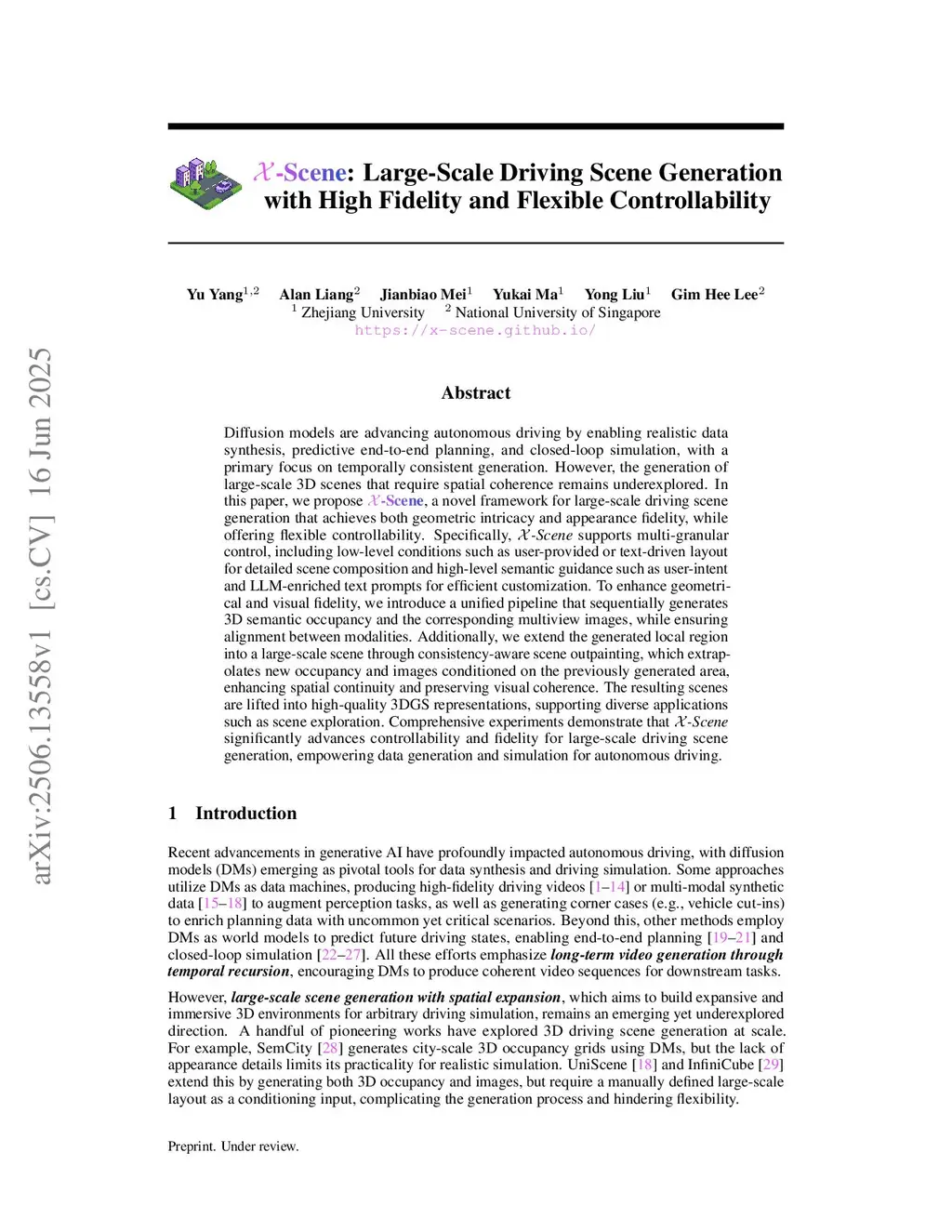 Diffusion models are advancing autonomous driving by enabling realistic data synthesis, predictive end-to-end planning, and closed-loop simulation, with a primary focus on temporally consistent generation. However, the generation of large-scale 3D scenes that require spatial coherence remains underexplored. In this paper, we propose X-Scene, a novel framework for large-scale driving scene generation that achieves both geometric intricacy and appearance fidelity, while offering flexible controllability. Specifically, X-Scene supports multi-granular control, including low-level conditions such as user-provided or text-driven layout for detailed scene composition and high-level semantic guidance such as user-intent and LLM-enriched text prompts for efficient customization. To enhance geometrical and visual fidelity, we introduce a unified pipeline that sequentially generates 3D semantic occupancy and the corresponding multiview images, while ensuring alignment between modalities. Additionally, we extend the generated local region into a large-scale scene through consistency-aware scene outpainting, which extrapolates new occupancy and images conditioned on the previously generated area, enhancing spatial continuity and preserving visual coherence. The resulting scenes are lifted into high-quality 3DGS representations, supporting diverse applications such as scene exploration. Comprehensive experiments demonstrate that X-Scene significantly advances controllability and fidelity for large-scale driving scene generation, empowering data generation and simulation for autonomous driving.