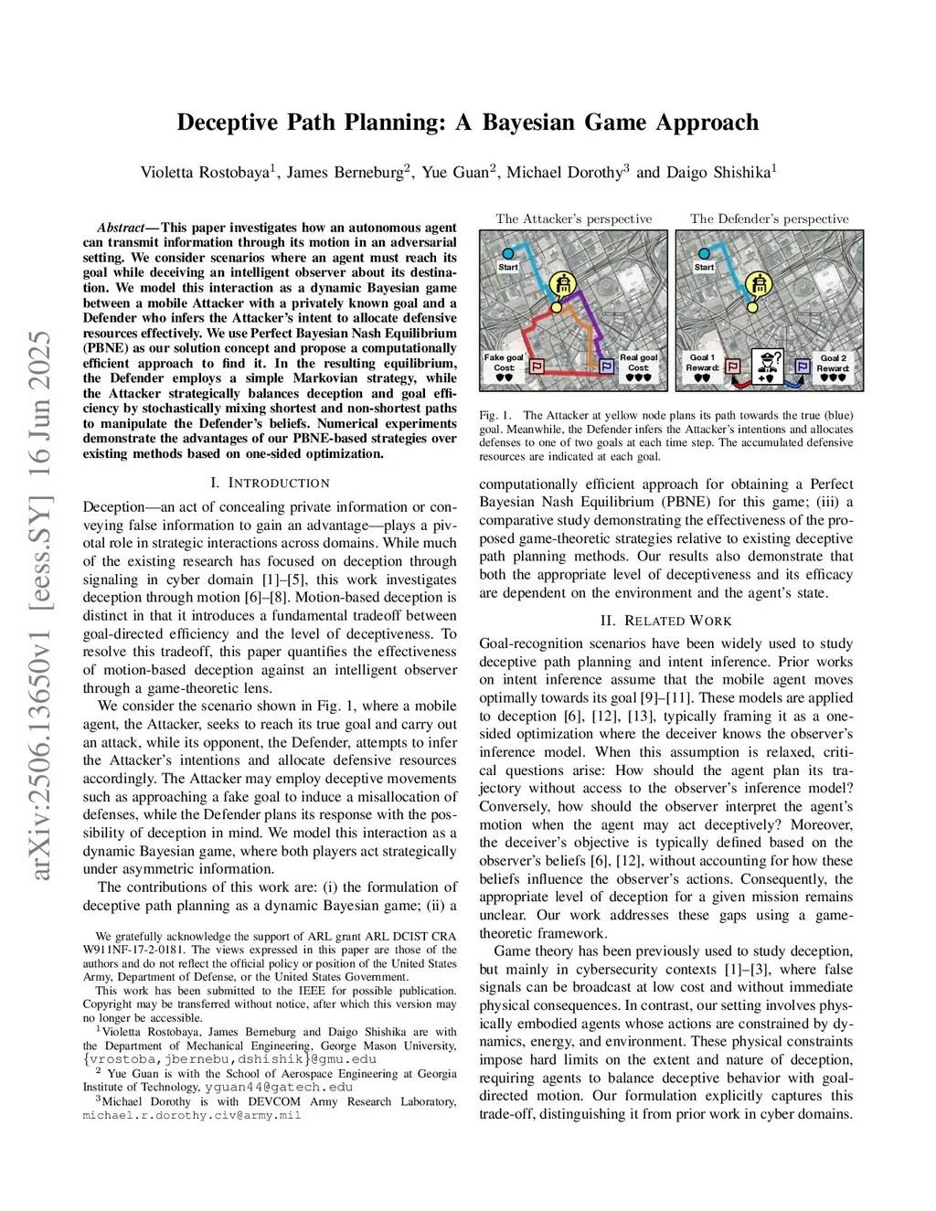This paper investigates how an autonomous agent can transmit information through its motion in an adversarial setting. We consider scenarios where an agent must reach its goal while deceiving an intelligent observer about its destination. We model this interaction as a dynamic Bayesian game between a mobile Attacker with a privately known goal and a Defender who infers the Attacker's intent to allocate defensive resources effectively. We use Perfect Bayesian Nash Equilibrium (PBNE) as our solution concept and propose a computationally efficient approach to find it. In the resulting equilibrium, the Defender employs a simple Markovian strategy, while the Attacker strategically balances deception and goal efficiency by stochastically mixing shortest and non-shortest paths to manipulate the Defender's beliefs. Numerical experiments demonstrate the advantages of our PBNE-based strategies over existing methods based on one-sided optimization.