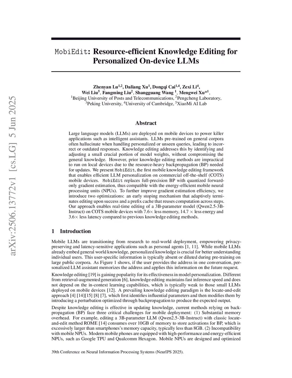 Large language models (LLMs) are deployed on mobile devices to power killer applications such as intelligent assistants. LLMs pre-trained on general corpora often hallucinate when handling personalized or unseen queries, leading to incorrect or outdated responses. Knowledge editing addresses this by identifying and adjusting a small crucial portion of model weights, without compromising the general knowledge. However, prior knowledge editing methods are impractical to run on local devices due to the resource-heavy backpropagation (BP) needed for updates. We present MobiEdit, the first mobile knowledge editing framework that enables efficient LLM personalization on commercial off-the-shelf (COTS) mobile devices. MobiEdit replaces full-precision BP with quantized forward-only gradient estimation, thus compatible with the energy-efficient mobile neural processing units (NPUs). MobiEdit replaces full-precision backpropagation with quantized forward-only gradient estimation, making it compatible with energy-efficient mobile NPUs. To further improve gradient estimation efficiency, we introduce two optimizations: an early stoping mechanism that adaptively terminates editing upon success and a prefix cache that reuses computation across steps. Our approach enables real-time editing of a 3B-parameter model (Qwen2.5-3B-Instruct) on COTS mobile devices with 7.6 less memory, 14.7 less energy and 3.6 less latency compared to previous knowledge editing methods.
