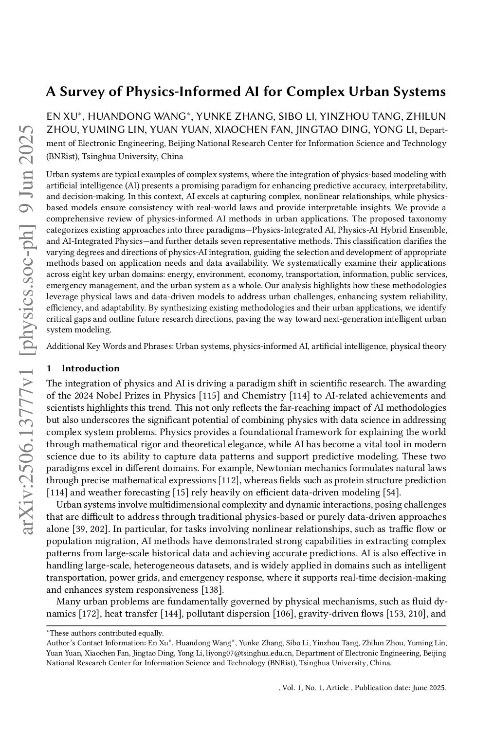 Urban systems are typical examples of complex systems, where the integration of physics-based modeling with artificial intelligence (AI) presents a promising paradigm for enhancing predictive accuracy, interpretability, and decision-making. In this context, AI excels at capturing complex, nonlinear relationships, while physics-based models ensure consistency with real-world laws and provide interpretable insights. We provide a comprehensive review of physics-informed AI methods in urban applications. The proposed taxonomy categorizes existing approaches into three paradigms - Physics-Integrated AI, Physics-AI Hybrid Ensemble, and AI-Integrated Physics - and further details seven representative methods. This classification clarifies the varying degrees and directions of physics-AI integration, guiding the selection and development of appropriate methods based on application needs and data availability. We systematically examine their applications across eight key urban domains: energy, environment, economy, transportation, information, public services, emergency management, and the urban system as a whole. Our analysis highlights how these methodologies leverage physical laws and data-driven models to address urban challenges, enhancing system reliability, efficiency, and adaptability. By synthesizing existing methodologies and their urban applications, we identify critical gaps and outline future research directions, paving the way toward next-generation intelligent urban system modeling.