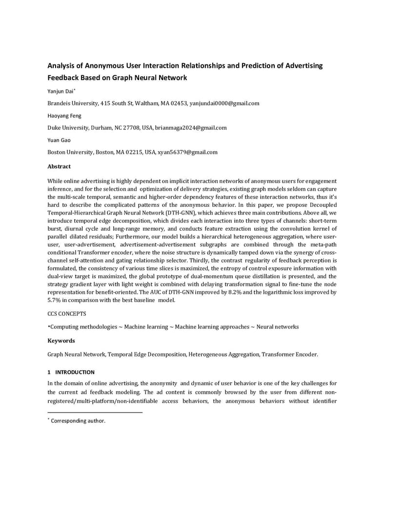 While online advertising is highly dependent on implicit interaction networks of anonymous users for engagement inference, and for the selection and optimization of delivery strategies, existing graph models seldom can capture the multi-scale temporal, semantic and higher-order dependency features of these interaction networks, thus it's hard to describe the complicated patterns of the anonymous behavior. In this paper, we propose Decoupled Temporal-Hierarchical Graph Neural Network (DTH-GNN), which achieves three main contributions. Above all, we introduce temporal edge decomposition, which divides each interaction into three types of channels: short-term burst, diurnal cycle and long-range memory, and conducts feature extraction using the convolution kernel of parallel dilated residuals; Furthermore, our model builds a hierarchical heterogeneous aggregation, where user-user, user-advertisement, advertisement-advertisement subgraphs are combined through the meta-path conditional Transformer encoder, where the noise structure is dynamically tamped down via the synergy of cross-channel self-attention and gating relationship selector. Thirdly, the contrast regularity of feedback perception is formulated, the consistency of various time slices is maximized, the entropy of control exposure information with dual-view target is maximized, the global prototype of dual-momentum queue distillation is presented, and the strategy gradient layer with light weight is combined with delaying transformation signal to fine-tune the node representation for benefit-oriented. The AUC of DTH-GNN improved by 8.2% and the logarithmic loss improved by 5.7% in comparison with the best baseline model.