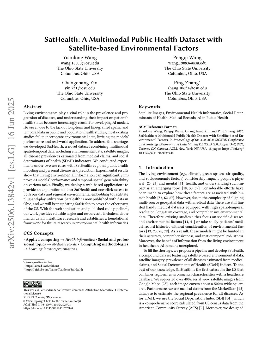 Living environments play a vital role in the prevalence and progression of diseases, and understanding their impact on patient's health status becomes increasingly crucial for developing AI models. However, due to the lack of long-term and fine-grained spatial and temporal data in public and population health studies, most existing studies fail to incorporate environmental data, limiting the models' performance and real-world application. To address this shortage, we developed SatHealth, a novel dataset combining multimodal spatiotemporal data, including environmental data, satellite images, all-disease prevalences estimated from medical claims, and social determinants of health (SDoH) indicators. We conducted experiments under two use cases with SatHealth: regional public health modeling and personal disease risk prediction. Experimental results show that living environmental information can significantly improve AI models' performance and temporal-spatial generalizability on various tasks. Finally, we deploy a web-based application to provide an exploration tool for SatHealth and one-click access to both our data and regional environmental embedding to facilitate plug-and-play utilization. SatHealth is now published with data in Ohio, and we will keep updating SatHealth to cover the other parts of the US. With the web application and published code pipeline, our work provides valuable angles and resources to include environmental data in healthcare research and establishes a foundational framework for future research in environmental health informatics.