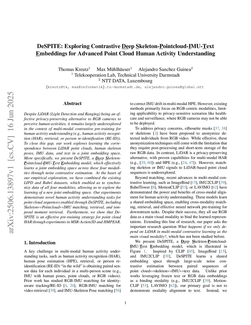 DeSPITE: Exploring Contrastive Deep Skeleton-Pointcloud-IMU-Text