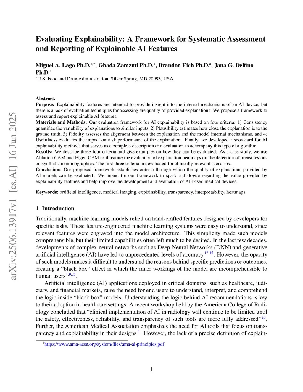 Explainability features are intended to provide insight into the internal mechanisms of an AI device, but there is a lack of evaluation techniques for assessing the quality of provided explanations. We propose a framework to assess and report explainable AI features. Our evaluation framework for AI explainability is based on four criteria: 1) Consistency quantifies the variability of explanations to similar inputs, 2) Plausibility estimates how close the explanation is to the ground truth, 3) Fidelity assesses the alignment between the explanation and the model internal mechanisms, and 4) Usefulness evaluates the impact on task performance of the explanation. Finally, we developed a scorecard for AI explainability methods that serves as a complete description and evaluation to accompany this type of algorithm. We describe these four criteria and give examples on how they can be evaluated. As a case study, we use Ablation CAM and Eigen CAM to illustrate the evaluation of explanation heatmaps on the detection of breast lesions on synthetic mammographies. The first three criteria are evaluated for clinically-relevant scenarios. Our proposed framework establishes criteria through which the quality of explanations provided by AI models can be evaluated. We intend for our framework to spark a dialogue regarding the value provided by explainability features and help improve the development and evaluation of AI-based medical devices.