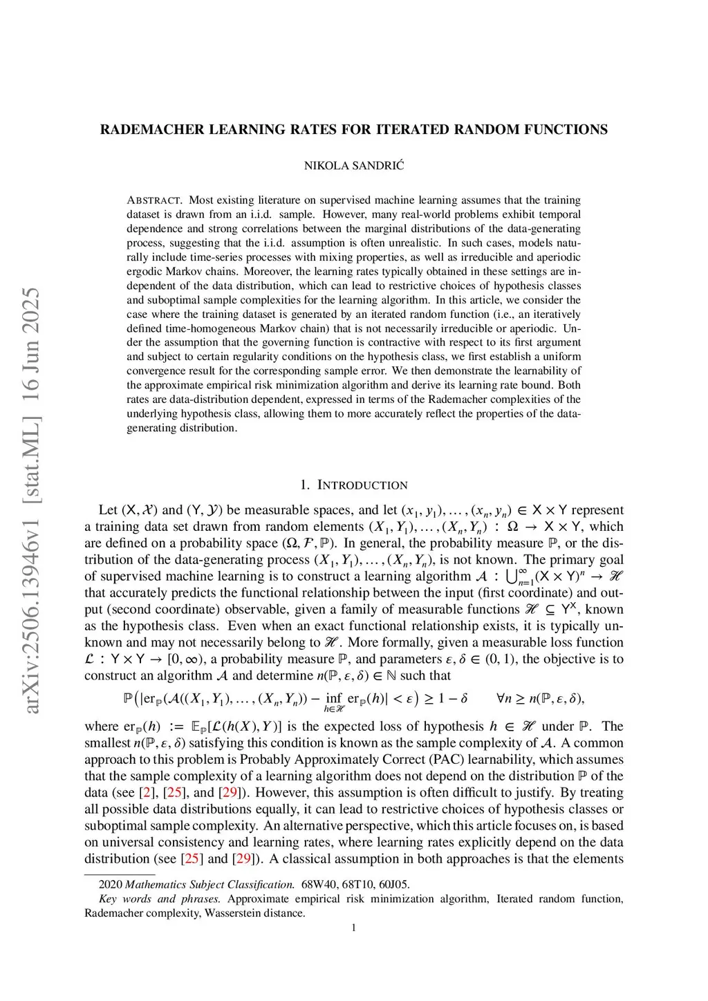 Most existing literature on supervised machine learning assumes that the training dataset is drawn from an i.i.d. sample. However, many real-world problems exhibit temporal dependence and strong correlations between the marginal distributions of the data-generating process, suggesting that the i.i.d. assumption is often unrealistic. In such cases, models naturally include time-series processes with mixing properties, as well as irreducible and aperiodic ergodic Markov chains. Moreover, the learning rates typically obtained in these settings are independent of the data distribution, which can lead to restrictive choices of hypothesis classes and suboptimal sample complexities for the learning algorithm. In this article, we consider the case where the training dataset is generated by an iterated random function (i.e., an iteratively defined time-homogeneous Markov chain) that is not necessarily irreducible or aperiodic. Under the assumption that the governing function is contractive with respect to its first argument and subject to certain regularity conditions on the hypothesis class, we first establish a uniform convergence result for the corresponding sample error. We then demonstrate the learnability of the approximate empirical risk minimization algorithm and derive its learning rate bound. Both rates are data-distribution dependent, expressed in terms of the Rademacher complexities of the underlying hypothesis class, allowing them to more accurately reflect the properties of the data-generating distribution.
