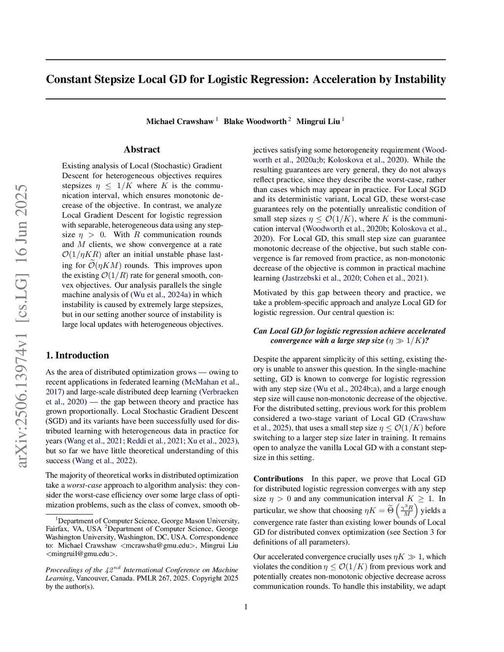 Existing analysis of Local (Stochastic) Gradient Descent for heterogeneous objectives requires stepsizes where is the communication interval, which ensures monotonic decrease of the objective. In contrast, we analyze Local Gradient Descent for logistic regression with separable, heterogeneous data using any stepsize . With communication rounds and clients, we show convergence at a rate after an initial unstable phase lasting for rounds. This improves upon the existing rate for general smooth, convex objectives. Our analysis parallels the single machine analysis of~\cite{wu2024large} in which instability is caused by extremely large stepsizes, but in our setting another source of instability is large local updates with heterogeneous objectives.