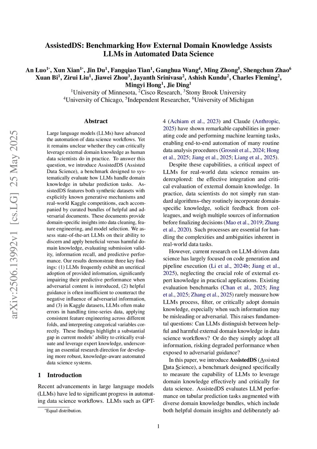 Large language models (LLMs) have advanced the automation of data science workflows. Yet it remains unclear whether they can critically leverage external domain knowledge as human data scientists do in practice. To answer this question, we introduce AssistedDS (Assisted Data Science), a benchmark designed to systematically evaluate how LLMs handle domain knowledge in tabular prediction tasks. AssistedDS features both synthetic datasets with explicitly known generative mechanisms and real-world Kaggle competitions, each accompanied by curated bundles of helpful and adversarial documents. These documents provide domain-specific insights into data cleaning, feature engineering, and model selection. We assess state-of-the-art LLMs on their ability to discern and apply beneficial versus harmful domain knowledge, evaluating submission validity, information recall, and predictive performance. Our results demonstrate three key findings: (1) LLMs frequently exhibit an uncritical adoption of provided information, significantly impairing their predictive performance when adversarial content is introduced, (2) helpful guidance is often insufficient to counteract the negative influence of adversarial information, and (3) in Kaggle datasets, LLMs often make errors in handling time-series data, applying consistent feature engineering across different folds, and interpreting categorical variables correctly. These findings highlight a substantial gap in current models' ability to critically evaluate and leverage expert knowledge, underscoring an essential research direction for developing more robust, knowledge-aware automated data science systems. Our data and code are publicly available here:this https URL