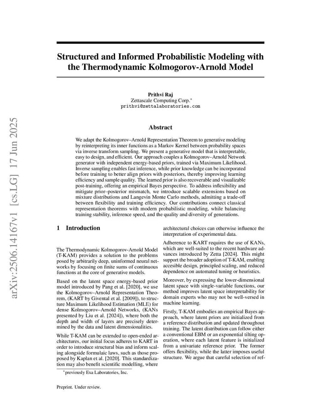 Learning an energy-based model (EBM) in the latent space of a top-down generative model offers a versatile framework for generation across multiple data modalities. However, it remains unclear how its interpretability can be used to guide model design, improve generative quality, and reduce training time. Moreover, the reliance on Langevin Monte Carlo (LMC) sampling presents challenges in efficiency and sampling multimodal latent distributions. In this work, we propose a novel adaptation of the Kolmogorov-Arnold representation theorem for generative modeling and introduce the Thermodynamic Kolmogorov-Arnold Model (T-KAM) to take advantage of structural and inductive biases. By constraining the prior to univariate relationships, T-KAM enables fast and exact inference via the inverse transform method. With the low dimensionality of the latent space and suitable inductive biases encoded, we demonstrate that importance sampling (IS) becomes a viable, unbiased, and highly efficient posterior sampler. For situations where IS fails, we investigate a novel strategy using population-based LMC, which decomposes posterior sampling into a sequence of annealed distributions to improve multimodal sampling. T-KAM elegantly balances common trade-offs in generative modeling, offering fast inference, interpretability, and stable training, while being naturally suited to upcoming Zettascale Computing Corp. hardware.