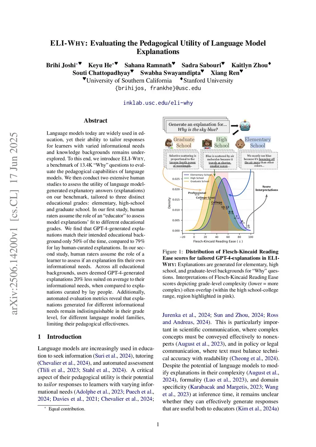 Language models today are widely used in education, yet their ability to tailor responses for learners with varied informational needs and knowledge backgrounds remains under-explored. To this end, we introduce ELI-Why, a benchmark of 13.4K "Why" questions to evaluate the pedagogical capabilities of language models. We then conduct two extensive human studies to assess the utility of language model-generated explanatory answers (explanations) on our benchmark, tailored to three distinct educational grades: elementary, high-school and graduate school. In our first study, human raters assume the role of an "educator" to assess model explanations' fit to different educational grades. We find that GPT-4-generated explanations match their intended educational background only 50% of the time, compared to 79% for lay human-curated explanations. In our second study, human raters assume the role of a learner to assess if an explanation fits their own informational needs. Across all educational backgrounds, users deemed GPT-4-generated explanations 20% less suited on average to their informational needs, when compared to explanations curated by lay people. Additionally, automated evaluation metrics reveal that explanations generated across different language model families for different informational needs remain indistinguishable in their grade-level, limiting their pedagogical effectiveness.