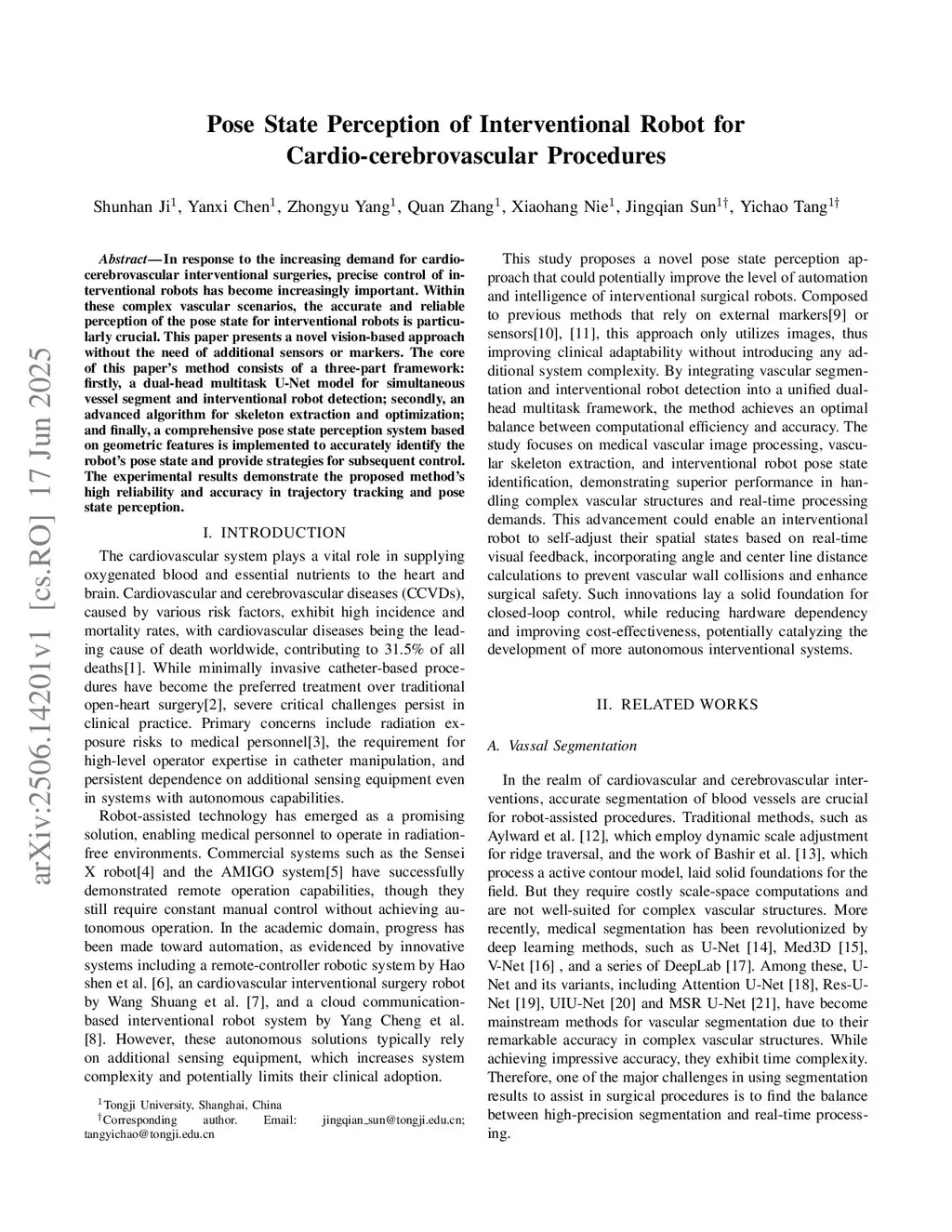 In response to the increasing demand for cardiocerebrovascular interventional surgeries, precise control of interventional robots has become increasingly important. Within these complex vascular scenarios, the accurate and reliable perception of the pose state for interventional robots is particularly crucial. This paper presents a novel vision-based approach without the need of additional sensors or markers. The core of this paper's method consists of a three-part framework: firstly, a dual-head multitask U-Net model for simultaneous vessel segment and interventional robot detection; secondly, an advanced algorithm for skeleton extraction and optimization; and finally, a comprehensive pose state perception system based on geometric features is implemented to accurately identify the robot's pose state and provide strategies for subsequent control. The experimental results demonstrate the proposed method's high reliability and accuracy in trajectory tracking and pose state perception.