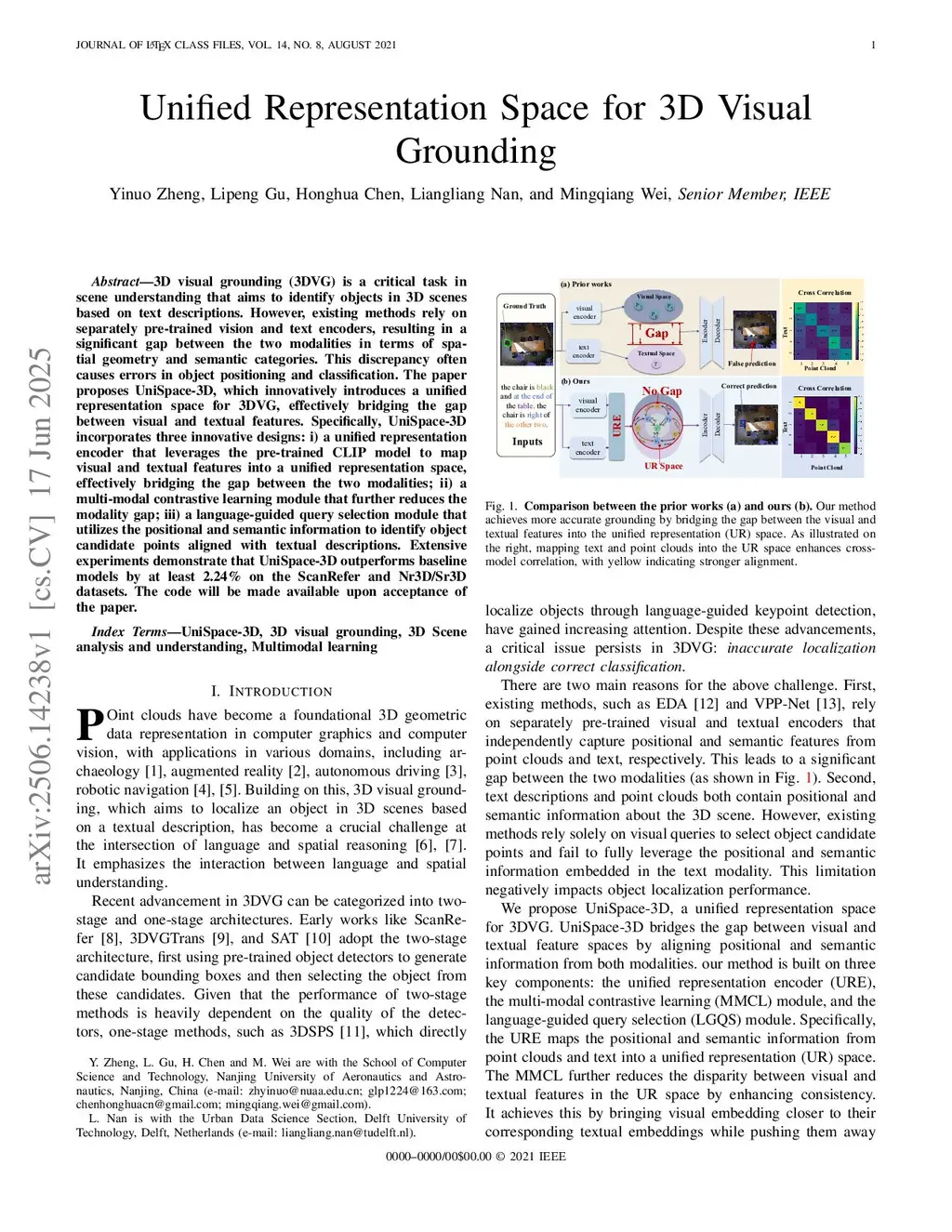 3D visual grounding (3DVG) is a critical task in scene understanding that aims to identify objects in 3D scenes based on text descriptions. However, existing methods rely on separately pre-trained vision and text encoders, resulting in a significant gap between the two modalities in terms of spatial geometry and semantic categories. This discrepancy often causes errors in object positioning and classification. The paper proposes UniSpace-3D, which innovatively introduces a unified representation space for 3DVG, effectively bridging the gap between visual and textual features. Specifically, UniSpace-3D incorporates three innovative designs: i) a unified representation encoder that leverages the pre-trained CLIP model to map visual and textual features into a unified representation space, effectively bridging the gap between the two modalities; ii) a multi-modal contrastive learning module that further reduces the modality gap; iii) a language-guided query selection module that utilizes the positional and semantic information to identify object candidate points aligned with textual descriptions. Extensive experiments demonstrate that UniSpace-3D outperforms baseline models by at least 2.24% on the ScanRefer and Nr3D/Sr3D datasets. The code will be made available upon acceptance of the paper.