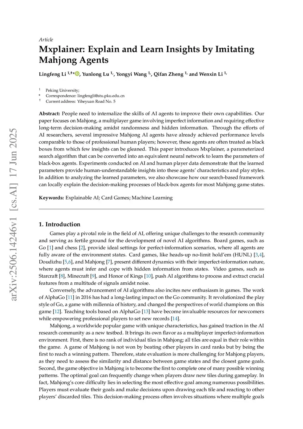 People need to internalize the skills of AI agents to improve their own capabilities. Our paper focuses on Mahjong, a multiplayer game involving imperfect information and requiring effective long-term decision-making amidst randomness and hidden information. Through the efforts of AI researchers, several impressive Mahjong AI agents have already achieved performance levels comparable to those of professional human players; however, these agents are often treated as black boxes from which few insights can be gleaned. This paper introduces Mxplainer, a parameterized search algorithm that can be converted into an equivalent neural network to learn the parameters of black-box agents. Experiments on both human and AI agents demonstrate that Mxplainer achieves a top-three action prediction accuracy of over 92% and 90%, respectively, while providing faithful and interpretable approximations that outperform decision-tree methods (34.8% top-three accuracy). This enables Mxplainer to deliver both strategy-level insights into agent characteristics and actionable, step-by-step explanations for individual decisions.