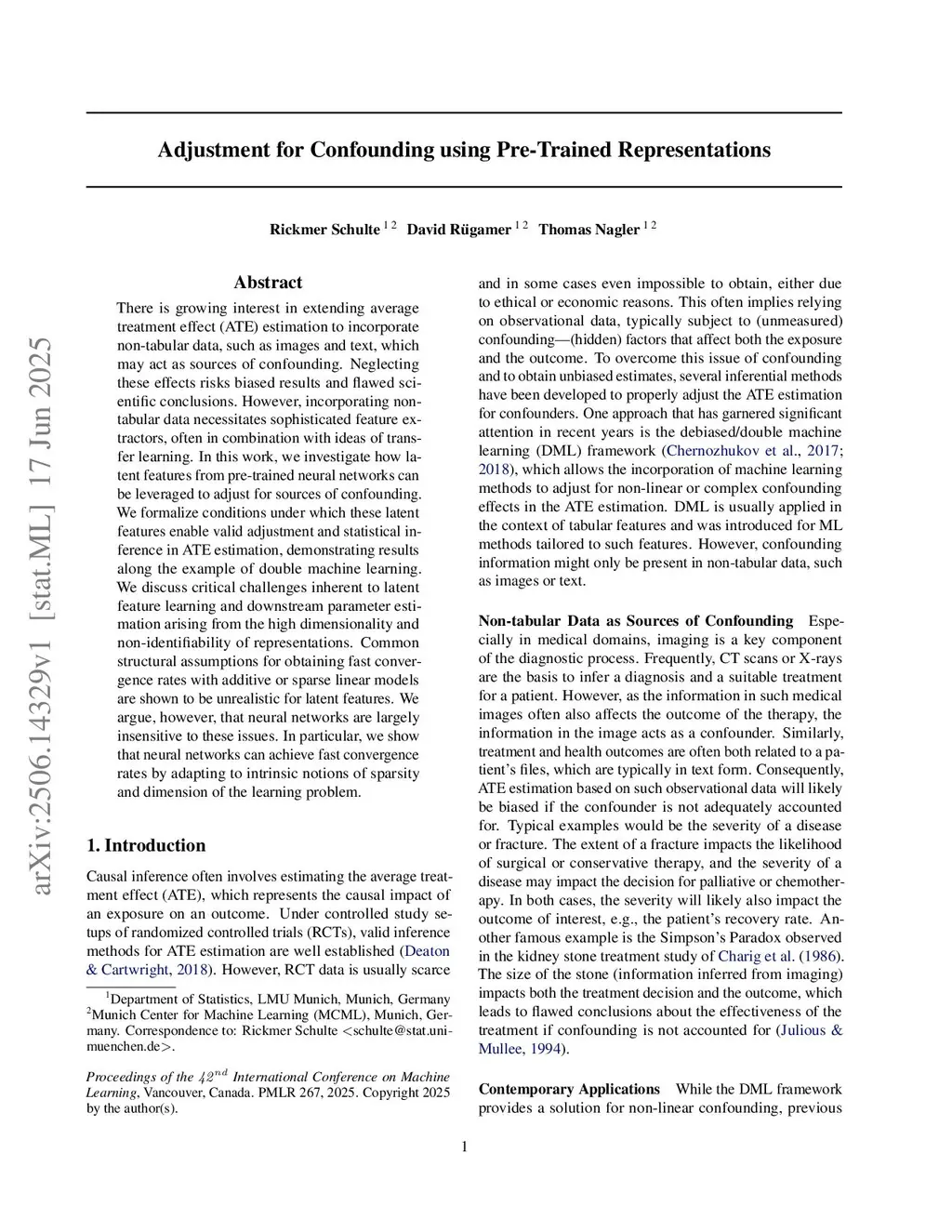 There is growing interest in extending average treatment effect (ATE) estimation to incorporate non-tabular data, such as images and text, which may act as sources of confounding. Neglecting these effects risks biased results and flawed scientific conclusions. However, incorporating non-tabular data necessitates sophisticated feature extractors, often in combination with ideas of transfer learning. In this work, we investigate how latent features from pre-trained neural networks can be leveraged to adjust for sources of confounding. We formalize conditions under which these latent features enable valid adjustment and statistical inference in ATE estimation, demonstrating results along the example of double machine learning. We discuss critical challenges inherent to latent feature learning and downstream parameter estimation arising from the high dimensionality and non-identifiability of representations. Common structural assumptions for obtaining fast convergence rates with additive or sparse linear models are shown to be unrealistic for latent features. We argue, however, that neural networks are largely insensitive to these issues. In particular, we show that neural networks can achieve fast convergence rates by adapting to intrinsic notions of sparsity and dimension of the learning problem.